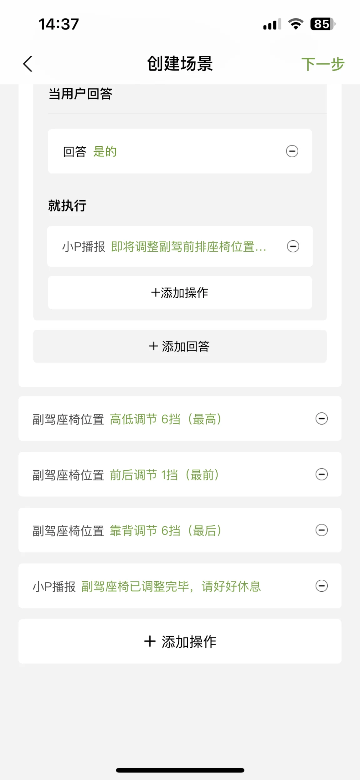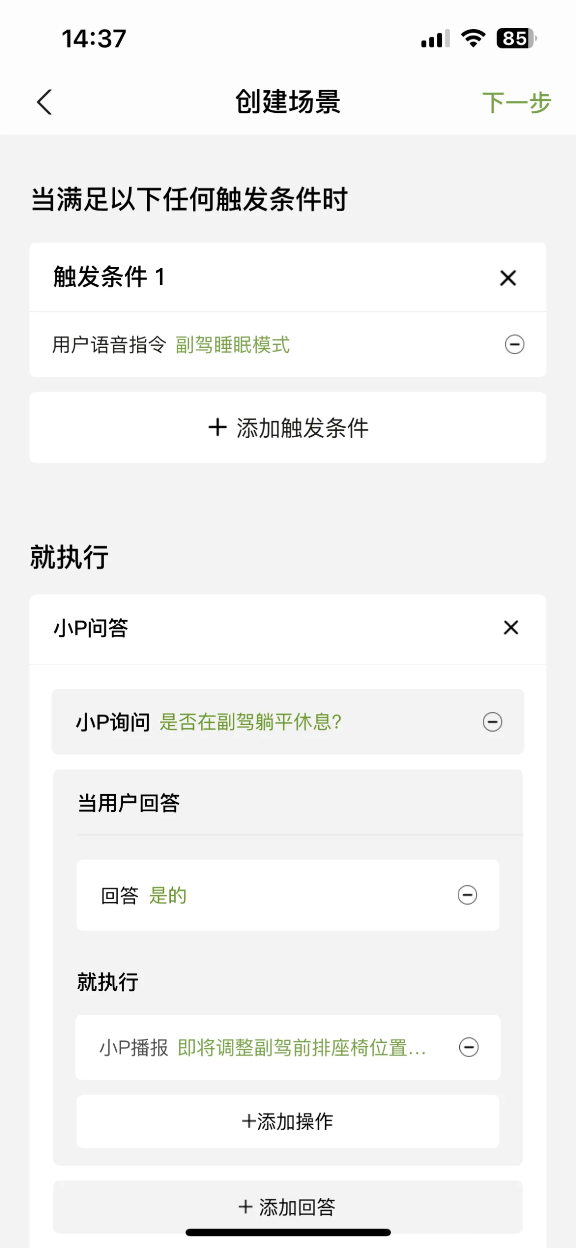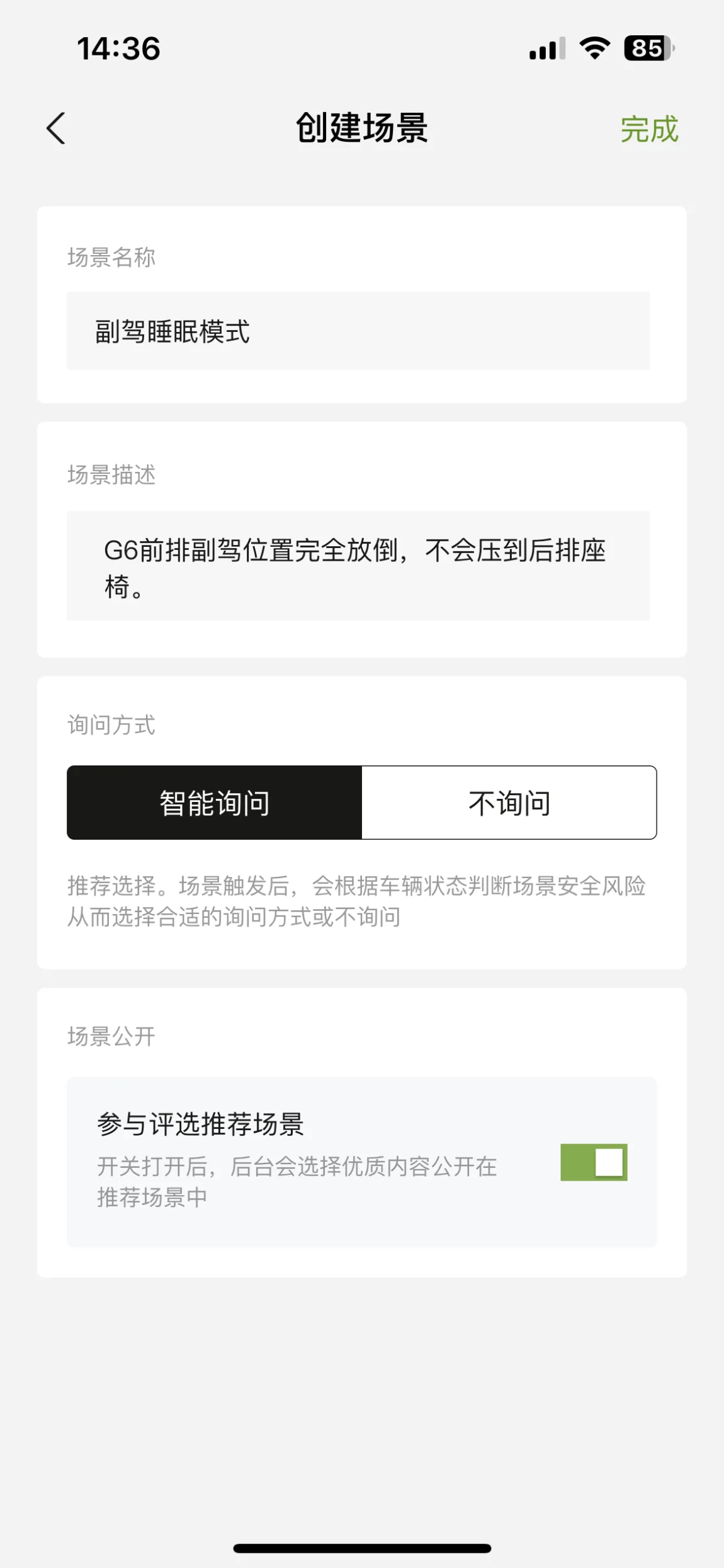#玩转智慧场景# 新能源车是非常适合在车内进行午休甚至是长时间睡觉的,因此后排都能够放倒,G6也可以,但是后排放倒意味着后备箱需要不放或者少放东西,如果能够像P5一样利用前排放倒,就能够不侵占后备箱空间,并且G6后排能够放倒一定角度,利用前排休息是非常方便舒适的。然而,小鹏对于这个功能没有认真宣传,导致很多到店体验的准车主和已经提车的车主都不清楚这个放倒前排的技巧,包括销售也不是每个都清楚,盲目地把座椅调最前再放倒会导致前排椅背压坏后排座椅。技巧在于,需要先把前排座椅调整到最高,再调整到最前,最后才完全放倒椅背,还要取下头枕。也算比较复杂的操作,因此可以用智慧场景实现。以下是我编辑的智慧场景,欢迎各位G6的鹏友参考。我的动态也会分享这个设置。