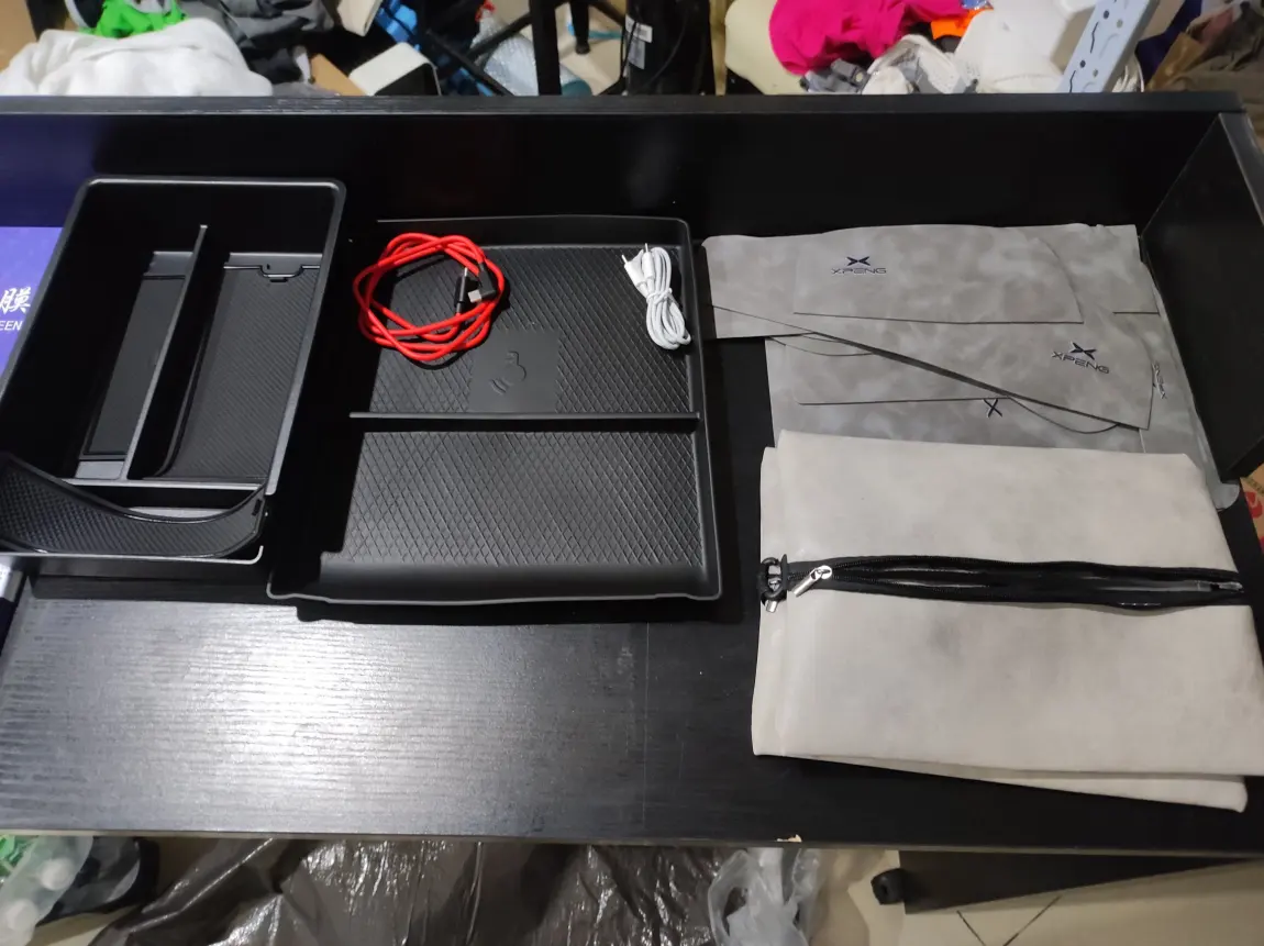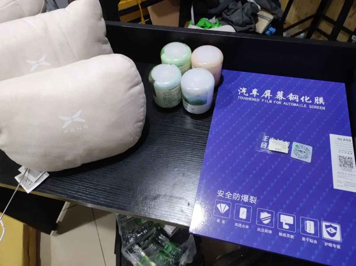 车内杯垫儿,门垫儿等13片,扶手箱盒,中控台下方盒,双膝c充电线2个,纸巾盒两个。屏幕保护膜,香香4个。腰靠头枕两对儿。透气打孔坐垫全套。