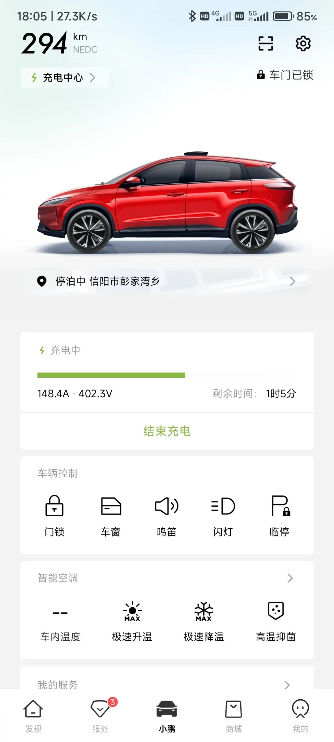 按照路线规划第一段到达京港澳高速许昌服务区(广州方向)小鹏超充站补能。根据路况按3:2:1分别使用了LCC、ACC和自主驾驶,时速120、运动、高动能回收模式,下午3点钟到达。全程125公里,耗时2小时16分钟,能耗14.2/100公里,车辆剩余370公里。许昌服务区小鹏超充站在服务区的最靠里边的位置,共设两个桩均空闲,耗时30分钟补能18.72度达95%(494公里),节约费用31.08元。