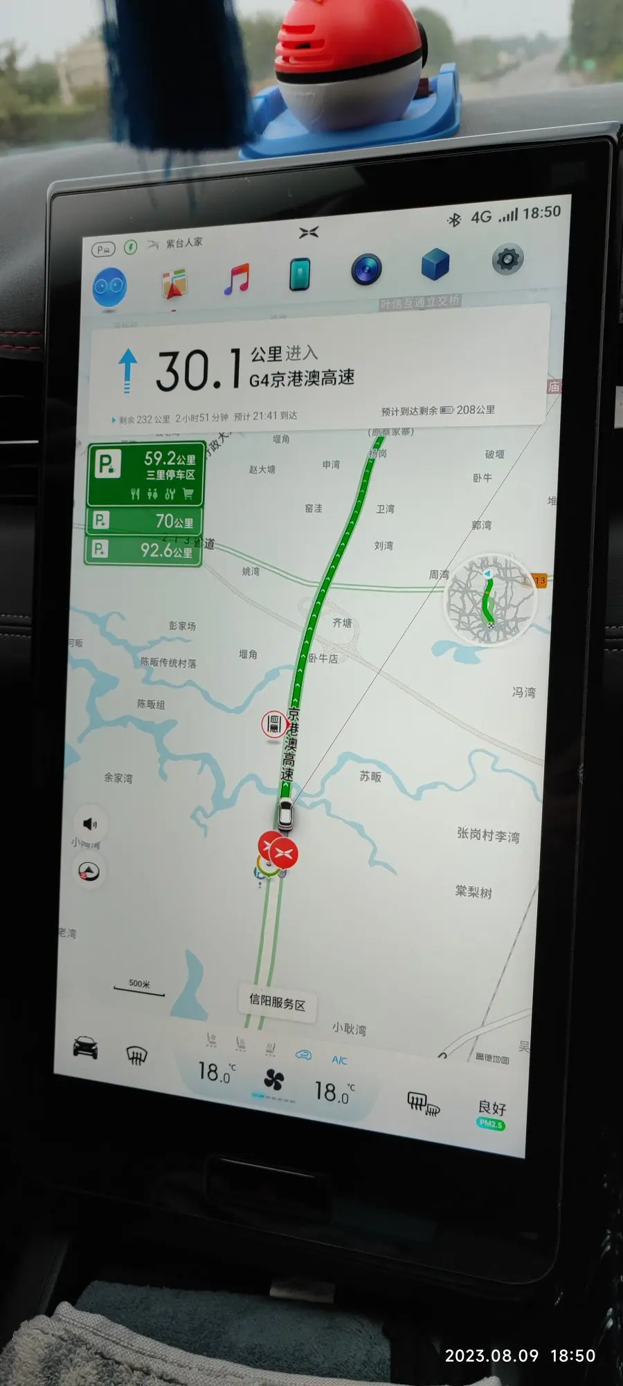 8月9日上午9点,到新乡大学源充电站补充能量,一个小时补能511公里(约98%)。下午13点01分,从家里准时出发,本来想在京港澳高速(金穗大道东)上高速,临时有事途径黄河大道、胡韦线、国道107、郑州中州大道,经郑州机场高速上京港澳高速,本段节约高速费45元,耗时一个小时。