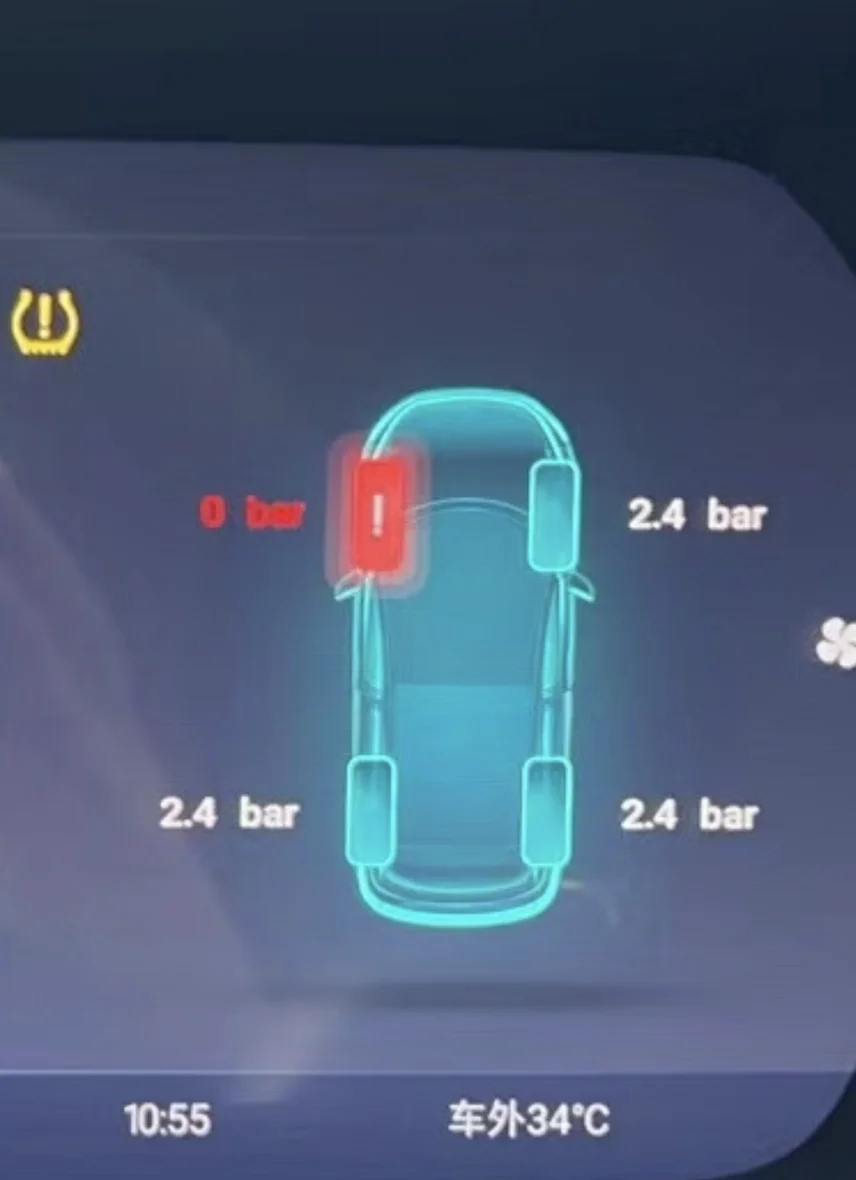 当显示如上图一致的时候毫无疑问,这一定是扎钉了,无论是什么钉都能对我们的轮胎造成一定的影响。这时候我们需要确定位置看钉子处在哪个位置。