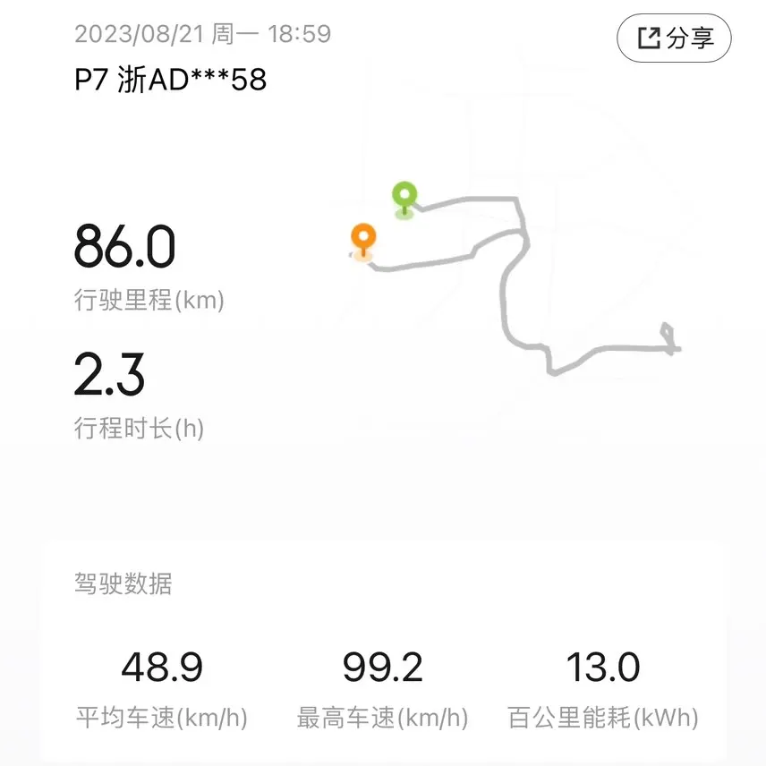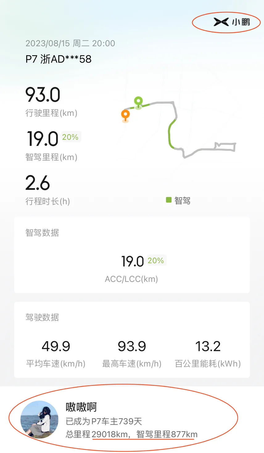 右上角页面还有分享按钮,可以自动生成图片分享到微信等地,会多了小鹏logo,成为车主时间,总里程和总智驾里程数据。这个真挺不错的,我会有主动分享这些已经整合好的数据到微信的欲望。