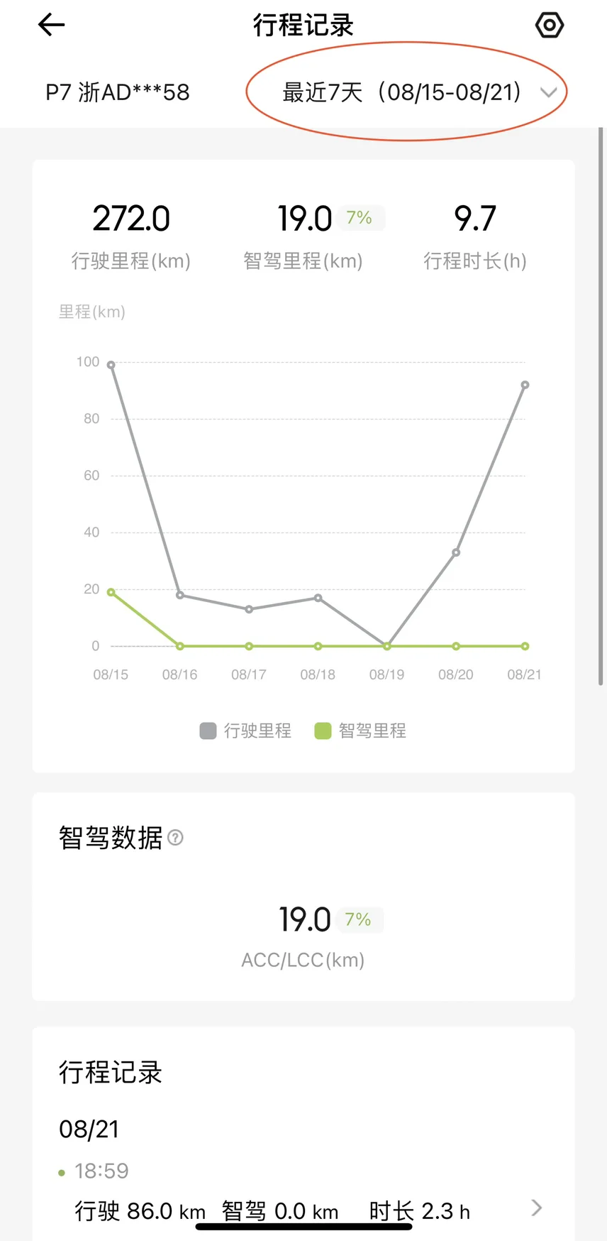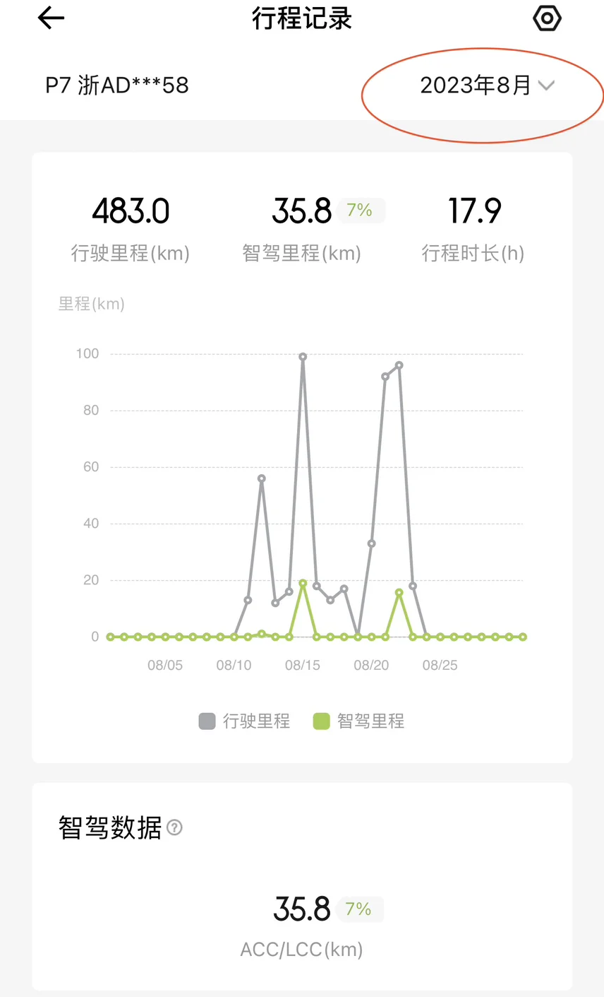 可以选择看最近7天或整月的行驶里程数据,智驾里程,总行程时间。其中使用了ACC、LCC或NGP的智驾里程还用百分比占比明确表示出来。