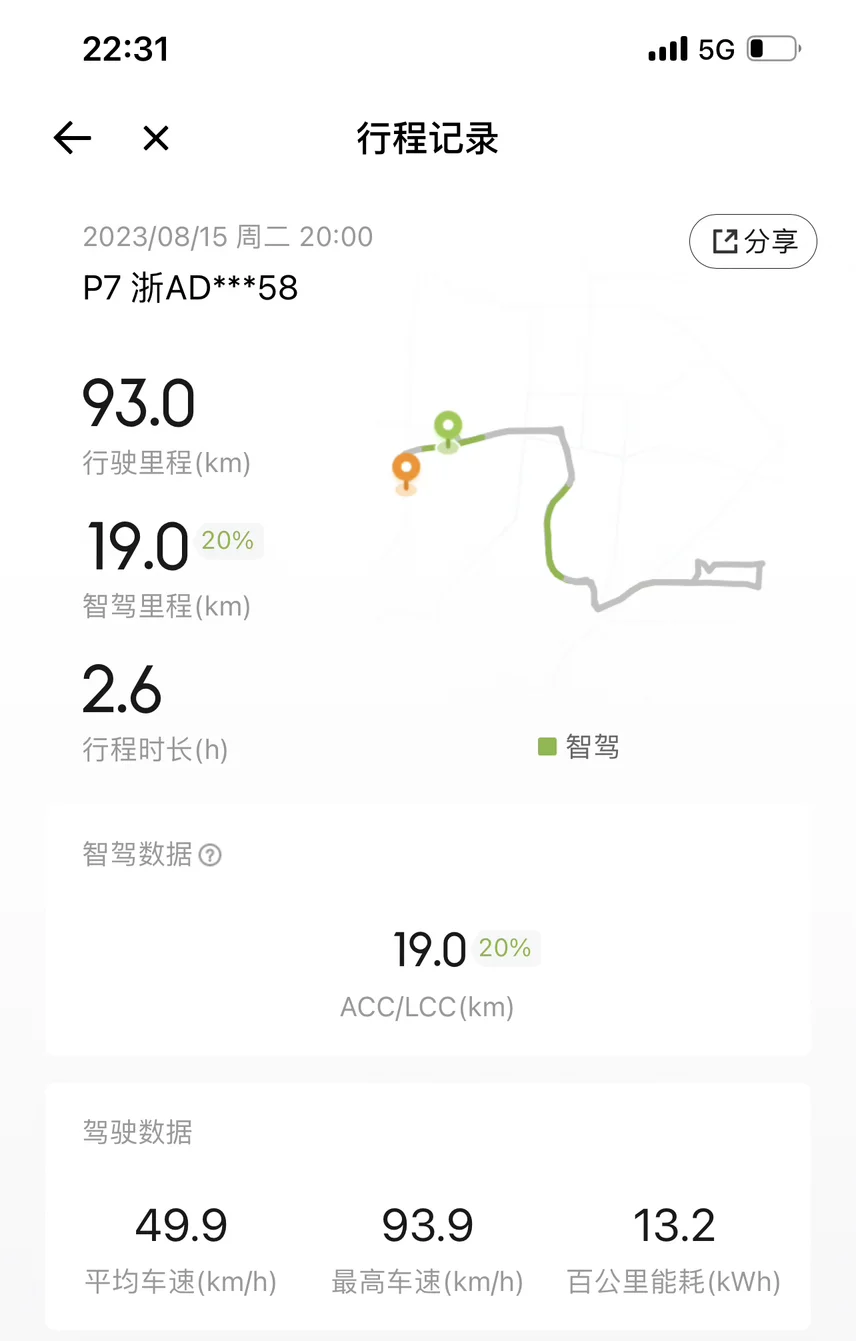 每段数据还可以点进去,会展示地图轨迹路线,和驾驶数据:平均车速,最高时速,百公里能耗。