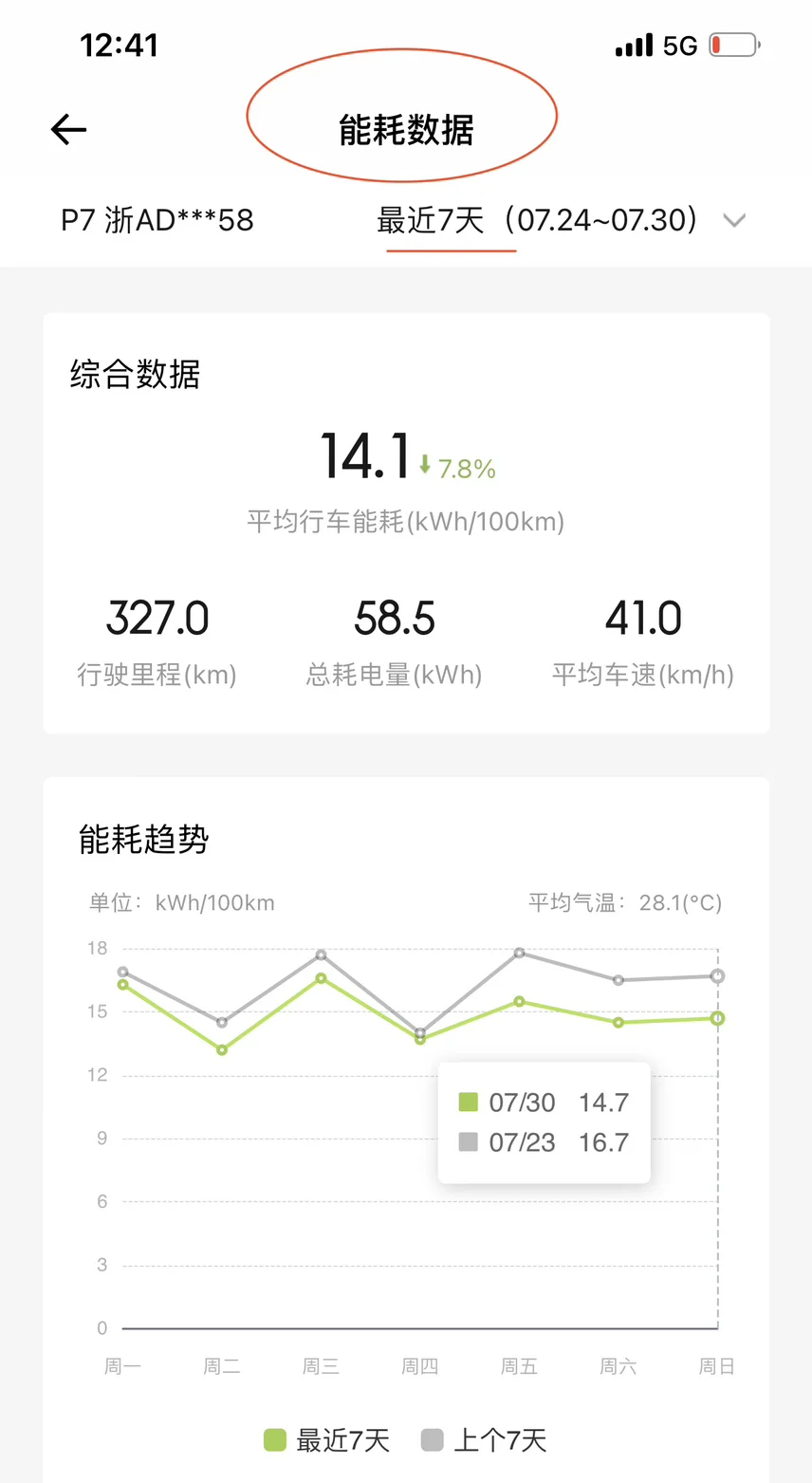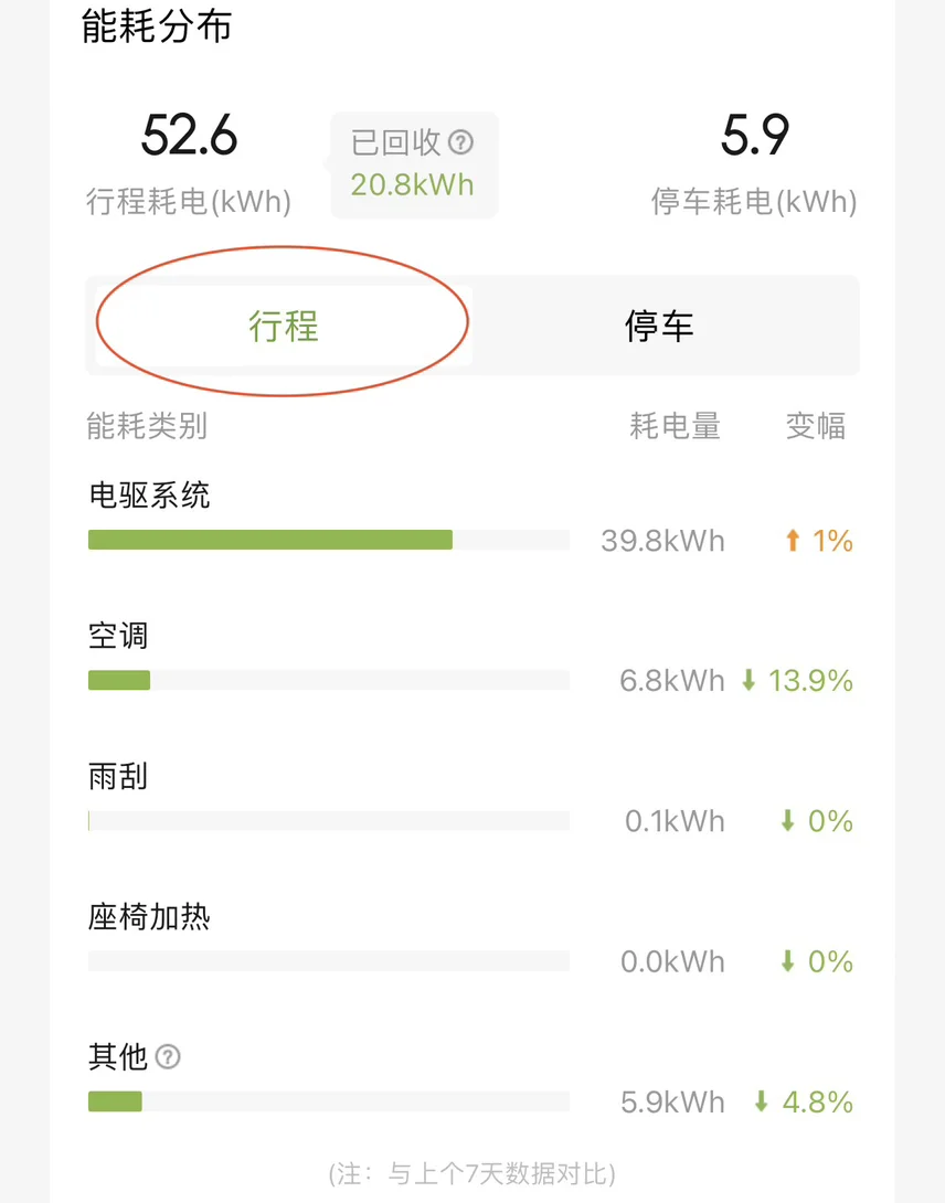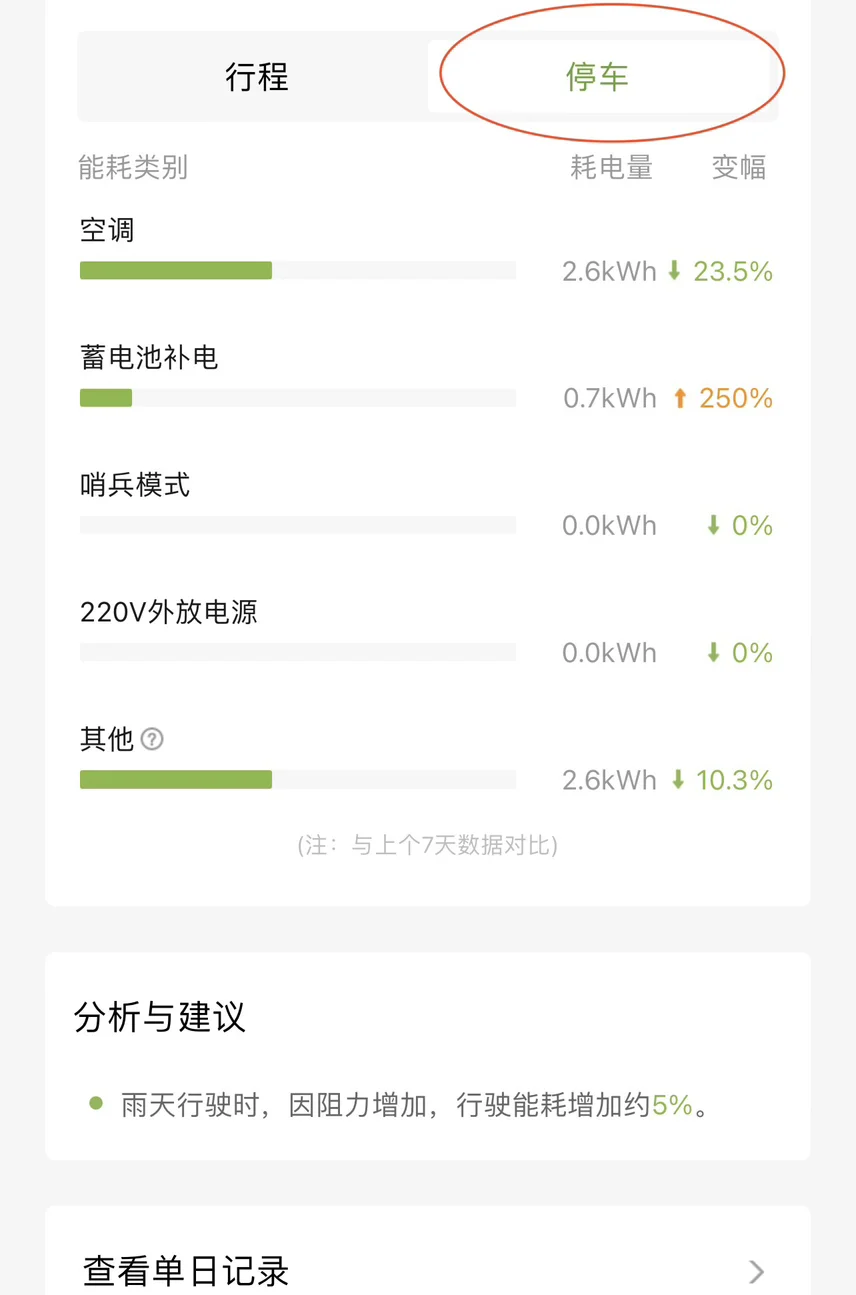 然后,最关心的能耗数据,还有一个地方能看,可以结合每天行驶数据和停车休息数据更加仔细的关注。(在一开始行程记录的左边,7天平均能耗数据)
