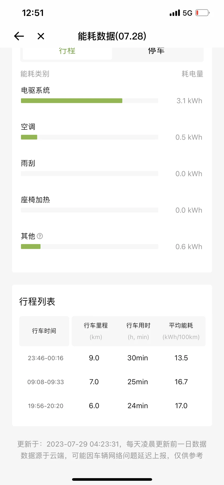 其中每天数据又可以点进去看到每段行驶路程的能耗数据:详细用车时间,行车里程,平均能耗。