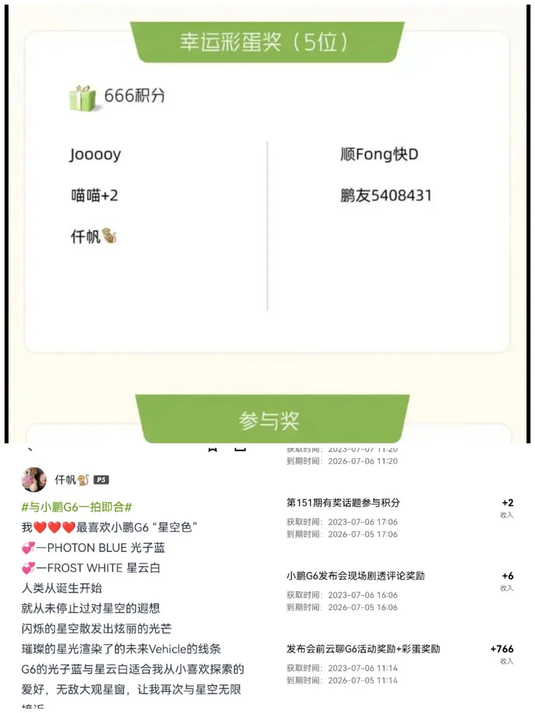 我的车生活小事记八(惊喜):2023年7月6日 ,一个小红点的消息提醒积分到账通知,原以为2积分的互动积分变成了三位数的766积分,尊嘟假嘟 O.o!擦擦眼睛,捏下脸蛋,真是太太太幸运了,原来是中了小鹏G6发布会前“云”聊小鹏G6送积分活动的彩蛋。