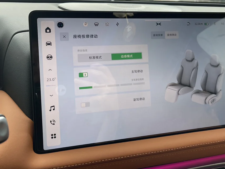 上面三步都是基本操作,这是音质已经很好啦,至少超越市面上80%的车机标配音质。最后,要注入一招“无限接近完美”的灵魂设置-震动!对就是那个人人喊打的座椅震动。如图,在座椅律动界面选择“动感模式”并保留一格的选项。OK,接下来就可以播放一首自己喜欢的歌曲,静静去感受去聆听。高音柔中音润低音深沉又富有弹性!这就是我分享的“无限接近完美”的小鹏G9丹拿设置。