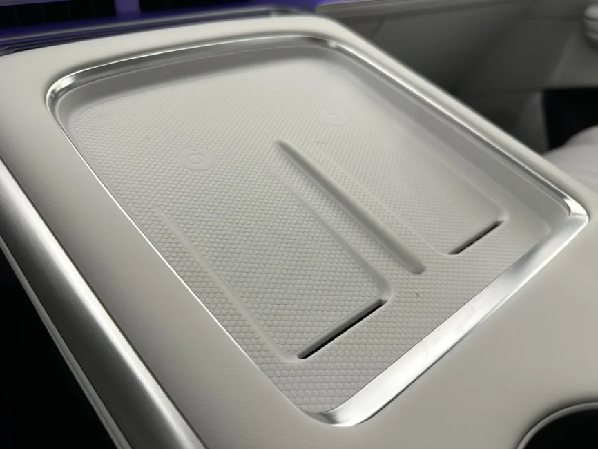 首先,就是我们G9老车主喊了又喊的双50w无线风冷快充,摸了摸质感,类似橡胶,起到一定的防滑效果,手机拿放很自由,基本随手放就能冲,老款可能需要对准一定位置,所以老款的鹏友们,先羡慕一下,然后老老实实插根充电线吧~