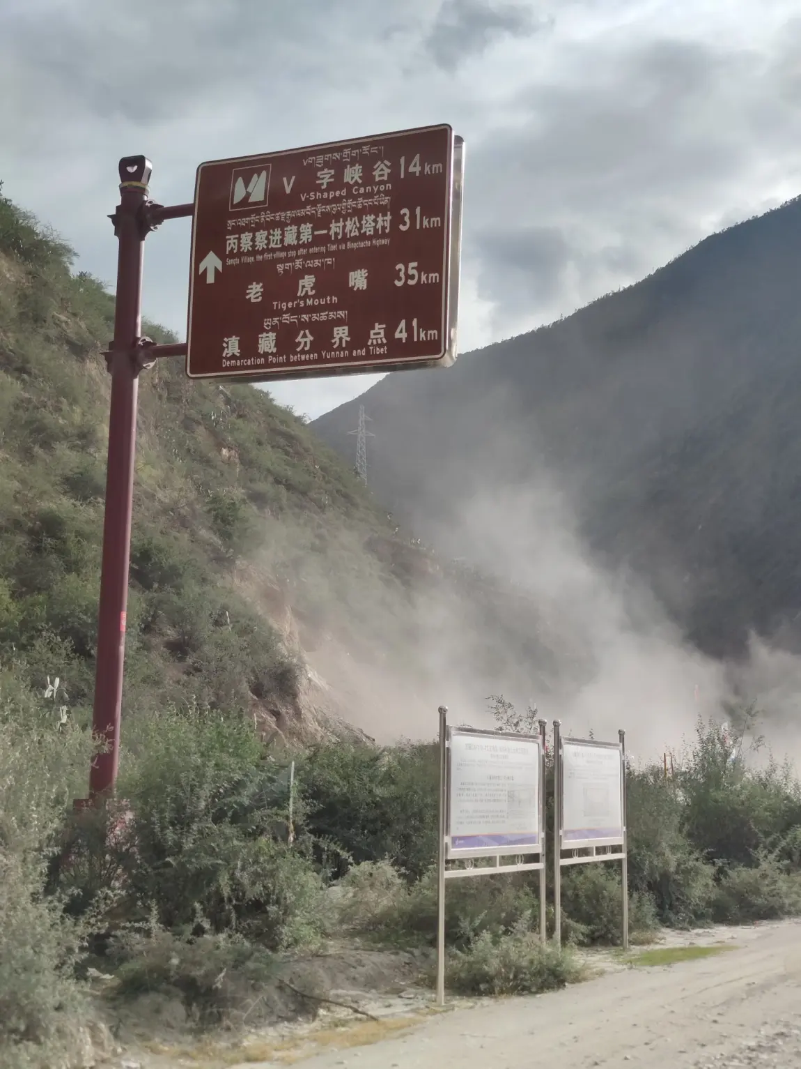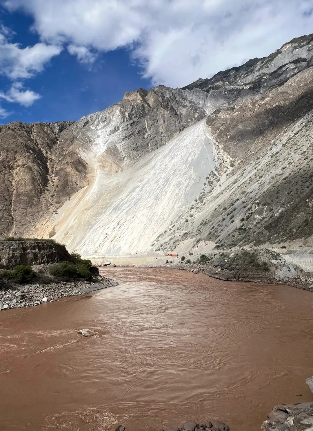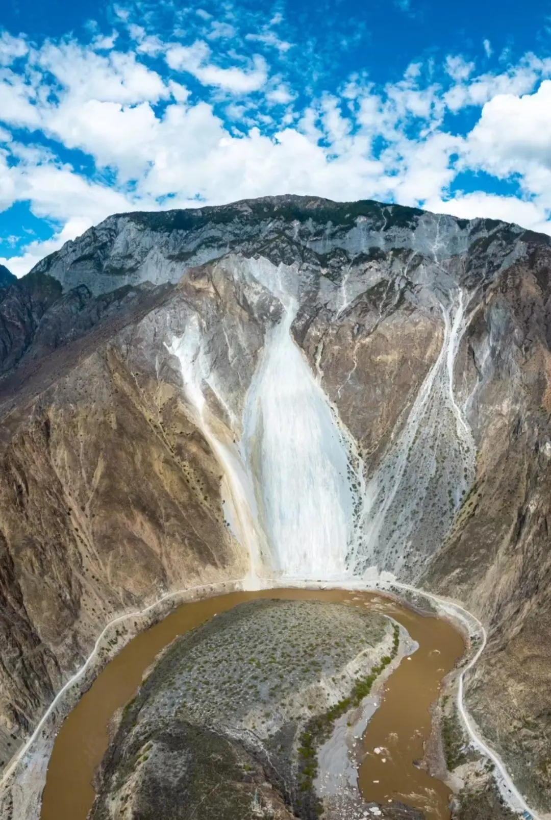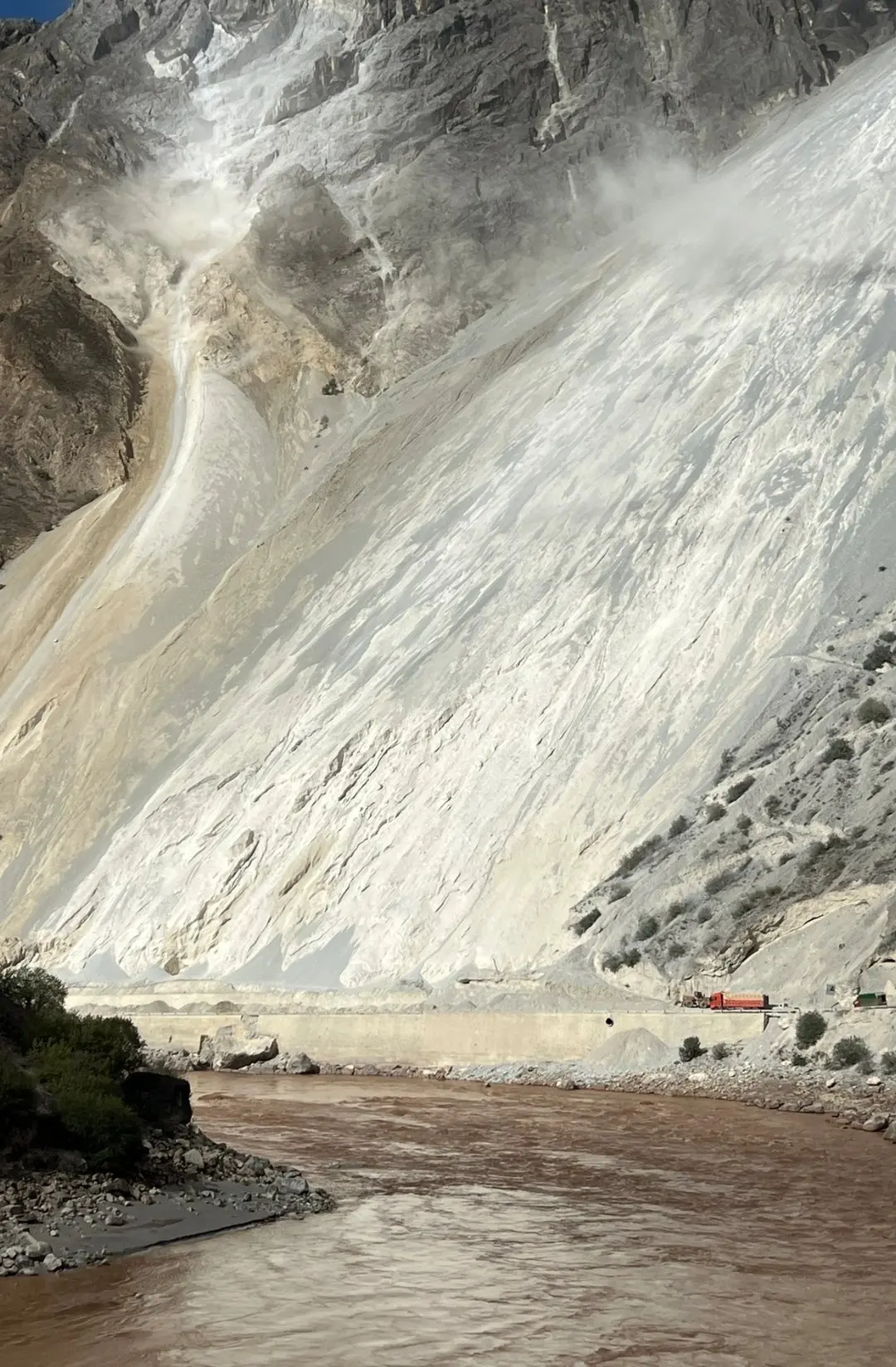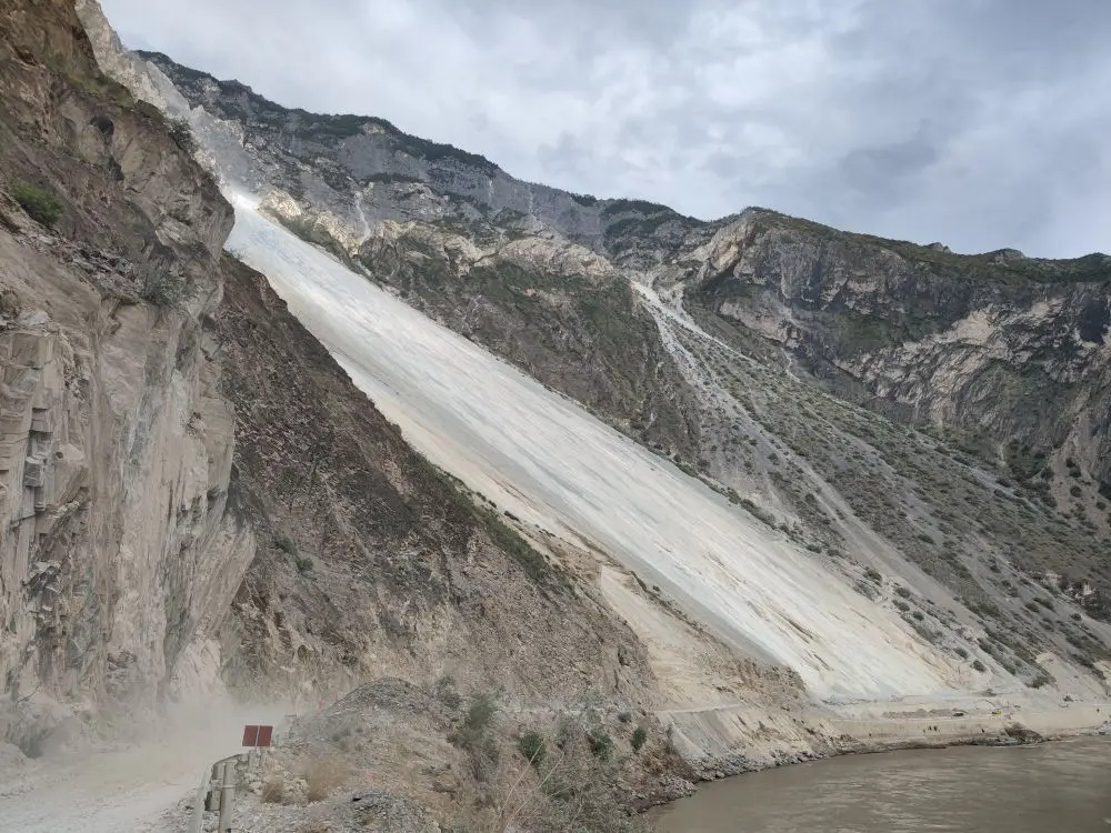 一旦有风,飞石不断从70度斜坡滚落怒江,大流沙犹如瀑布一泻而下,直插江底。
