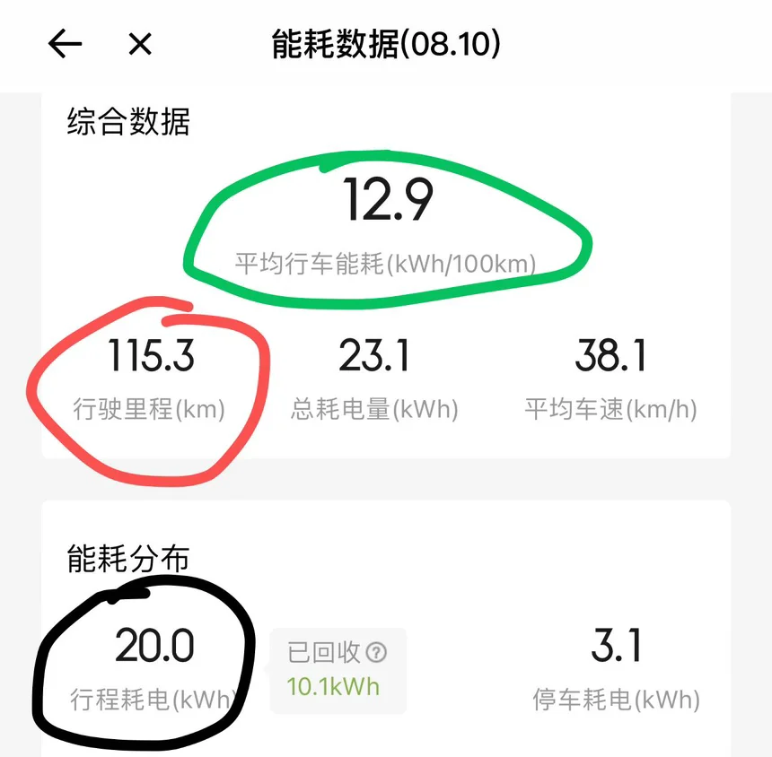 结论:所以用行程耗电除以行驶里程的结果的确跟平均行车电耗不相同。