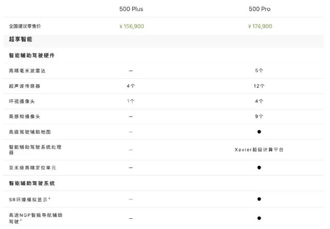 而 500 Pro 之所以比 500 Plus 价格更贵,原因就是智驾硬件差异。虽然全系取消激光雷达,但 Pro 版本搭载全向视觉摄像头和雷达传感器,和英伟达 Xavier 芯片,算力 30Tops,支持高速 NGP 、记忆泊车等领航辅助驾驶。Plus则更加适合老司机,去掉了那些辅助驾驶需要的硬件配置,把价格打下来,让更多老油车司机体验到电车的快乐…