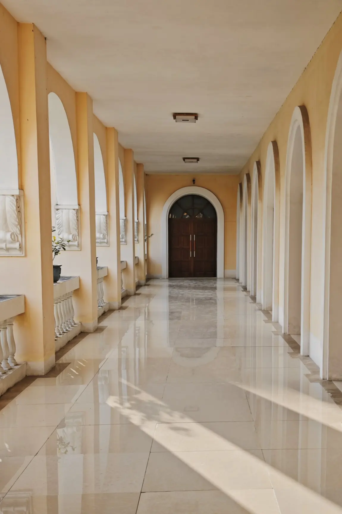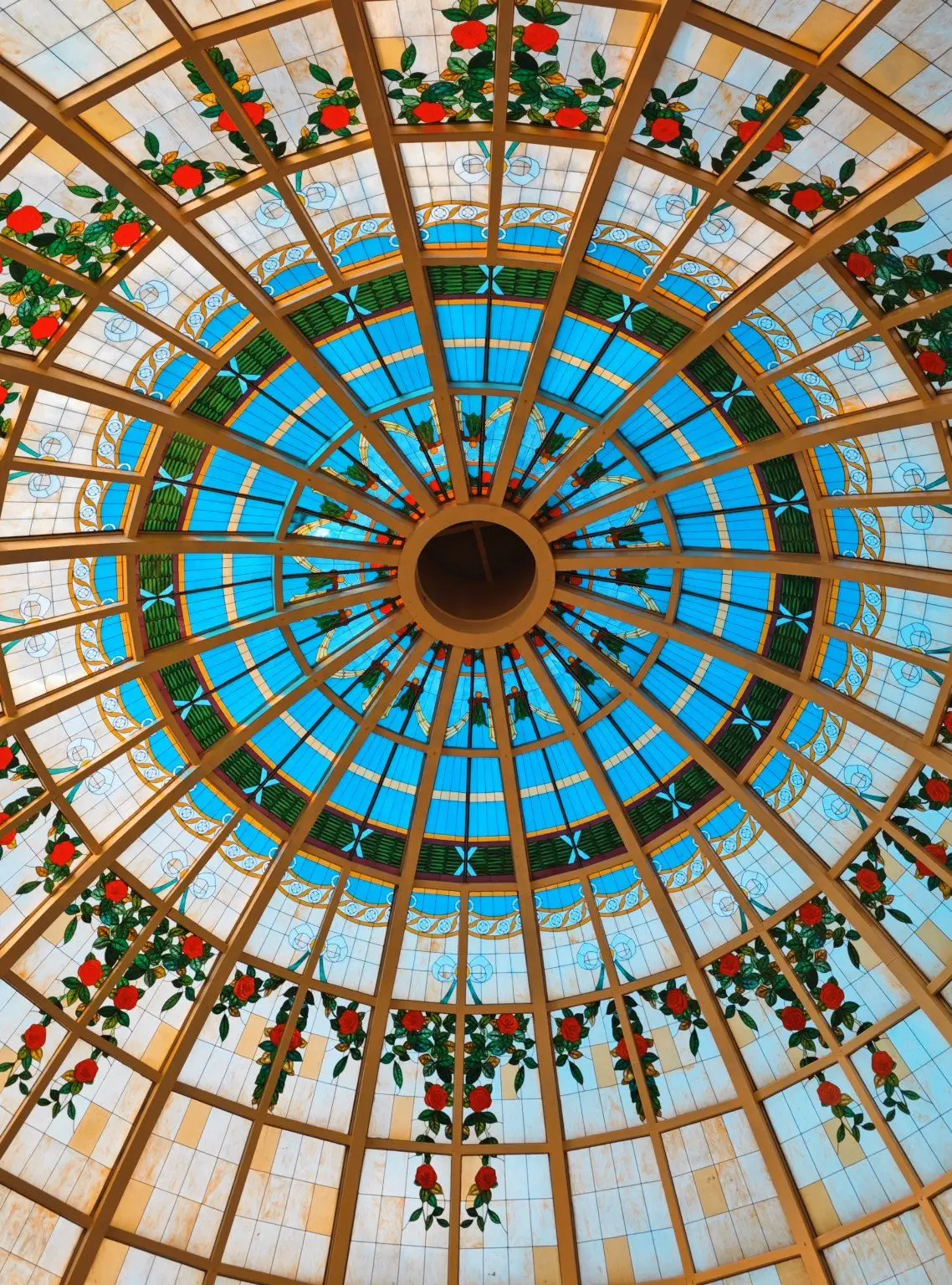 进入大牌坊会有个漂亮的园林,顺着人流进入可以看到非常漂亮的景观园林,进入安检的过程中可以看见一个非常漂亮的回廊和穹顶结构的建筑,五彩斑斓的玻璃顶非常梦幻
