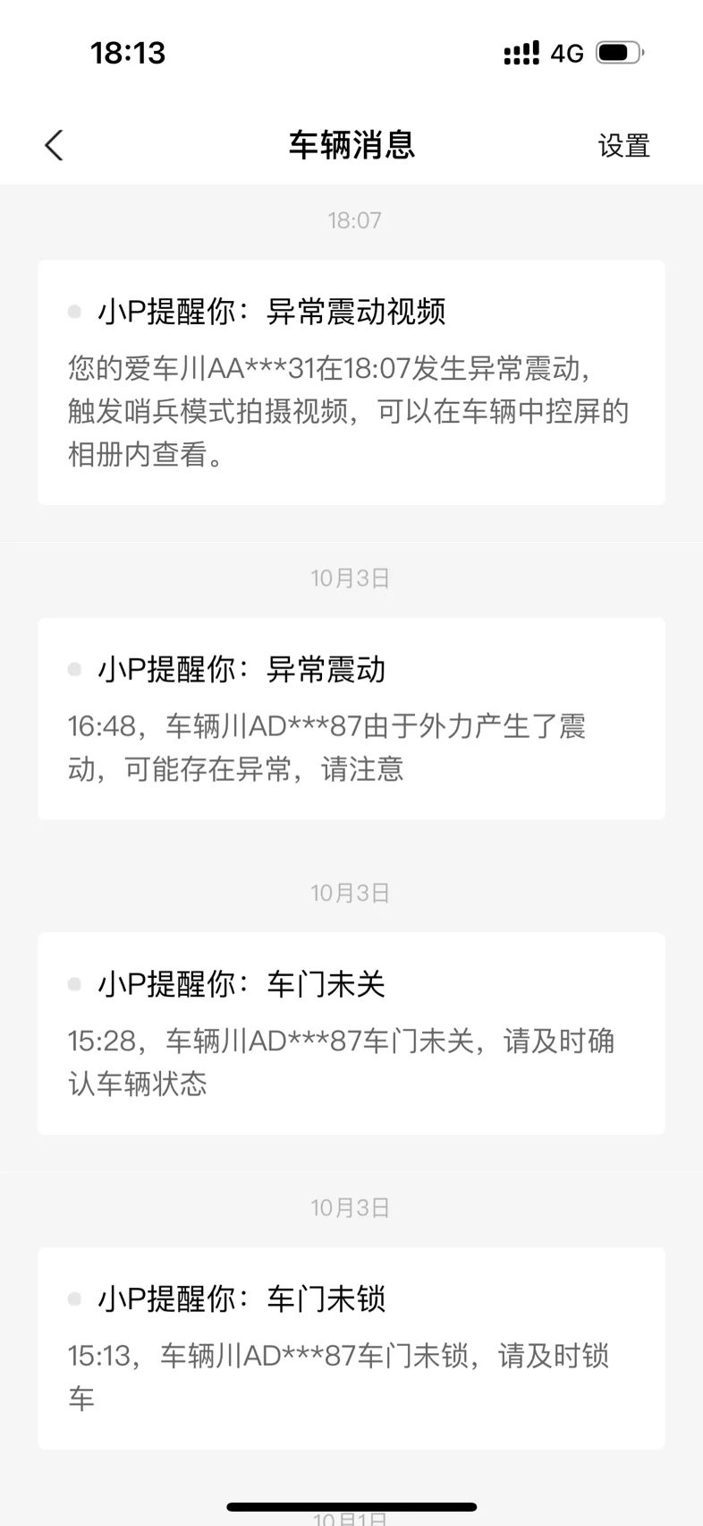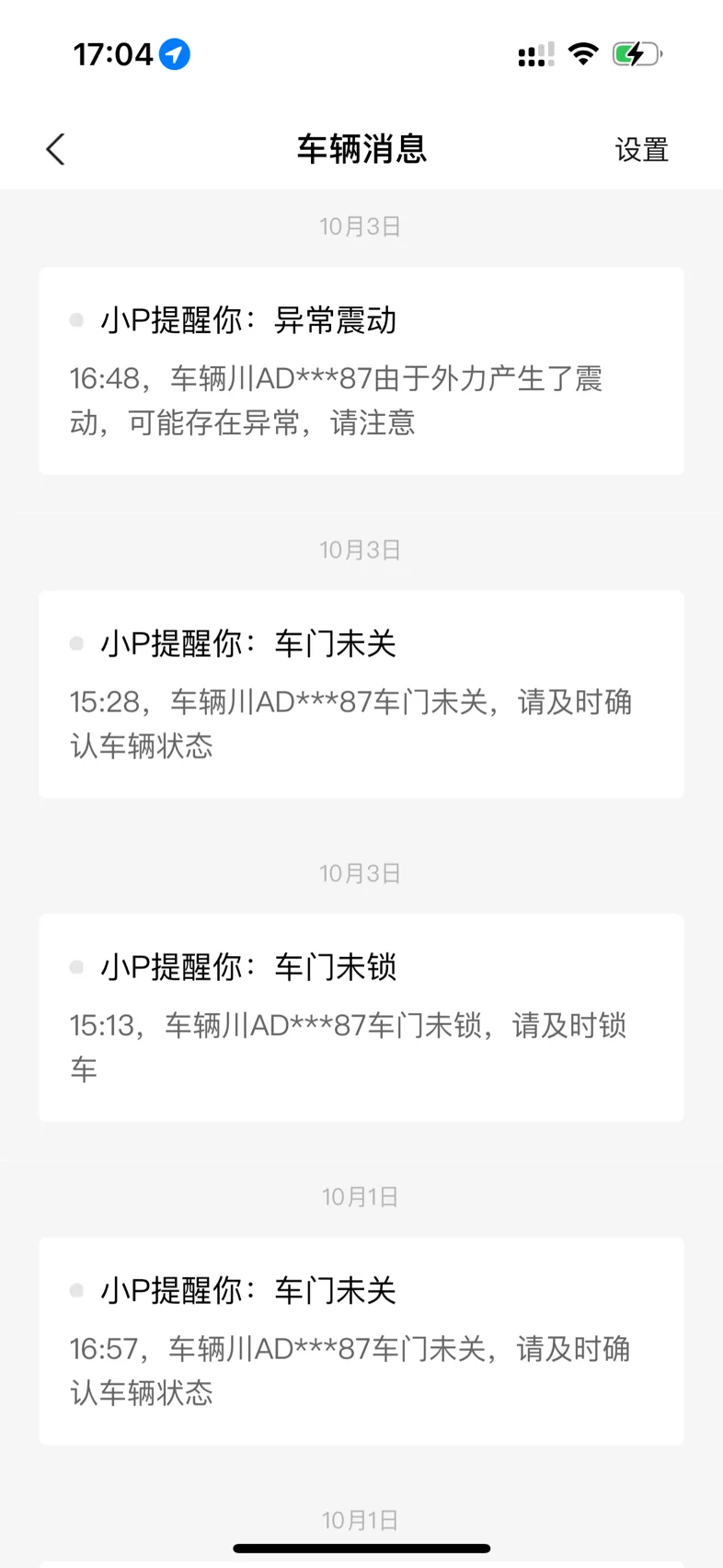 图二:朋友的P7未开哨兵模式的日常异常震动提醒(我有授权钥匙,车牌AD87),用脚踢轮胎测试我的P7i(车牌AR31)未有任何提示