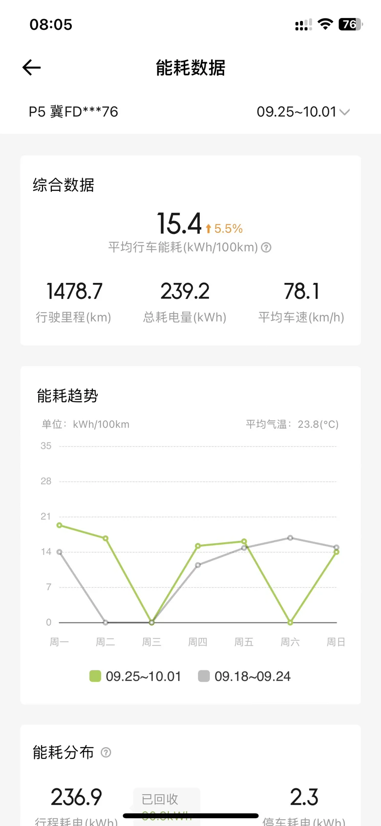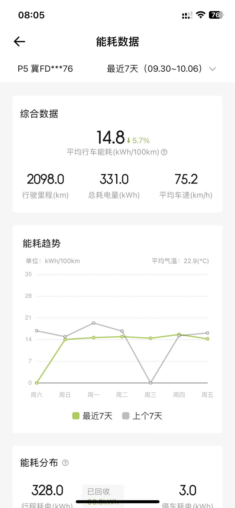 查看能耗报告,可以详细记录每天行使的具体里程和分时段的公里数和能耗数,感觉这个功能还是很用心的,以下是旅途返程的能耗图,在高速顶着限速开,能耗还是可以接受的。