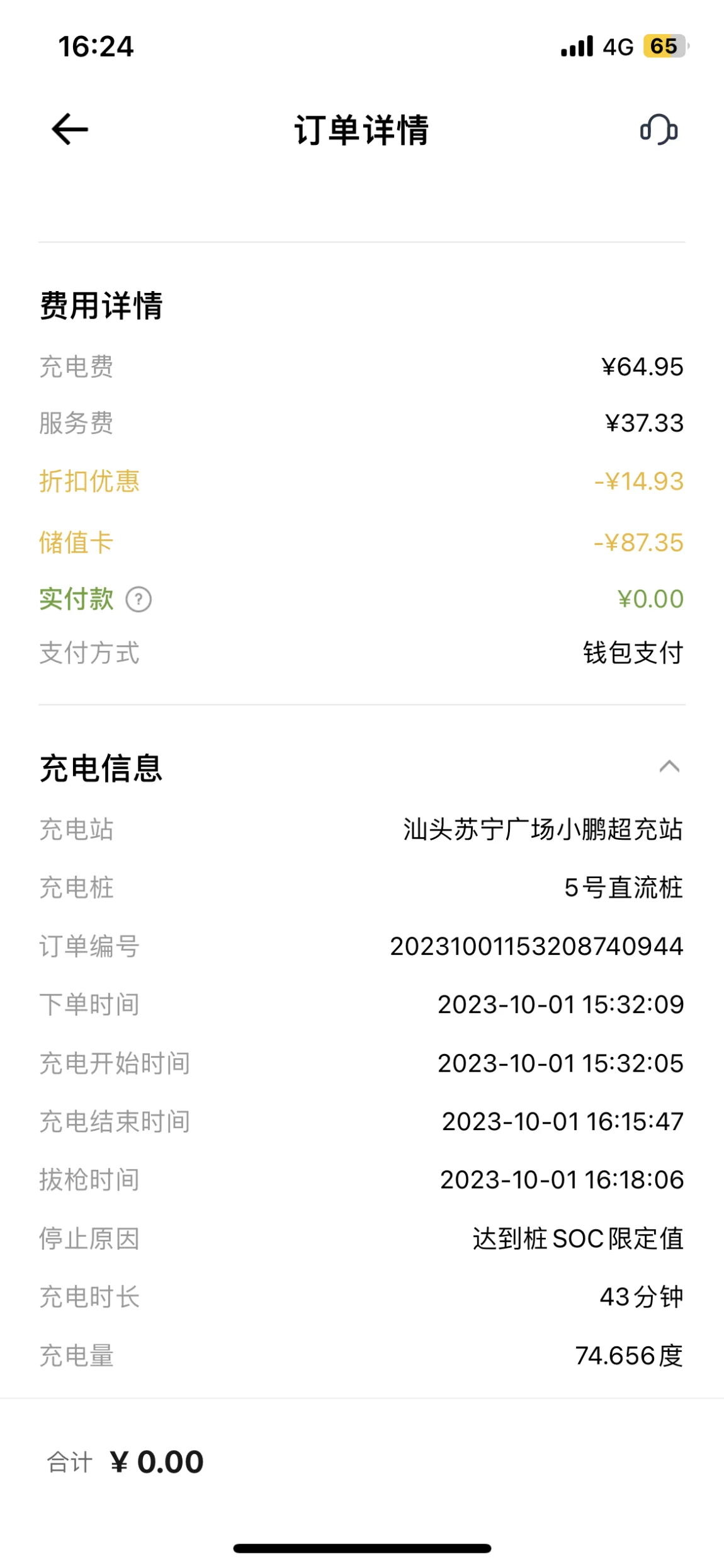 第二次:汕头,苏宁广场小鹏自营超充站,花费87.35,电卡支付,个人支付0元;