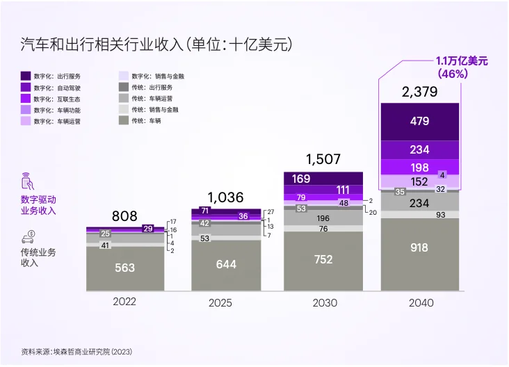 围绕数字服务,传统整车企业、科技巨头与造车新势力群雄逐鹿,已然打响了全新的收入争夺战。埃森哲商业研究院分析预估,到2040年,中国汽车行业数字化服务收入将增长16倍,超过一万亿美元(约七万亿人民币),接近汽车和出行行业总收入的半壁江山(46%)