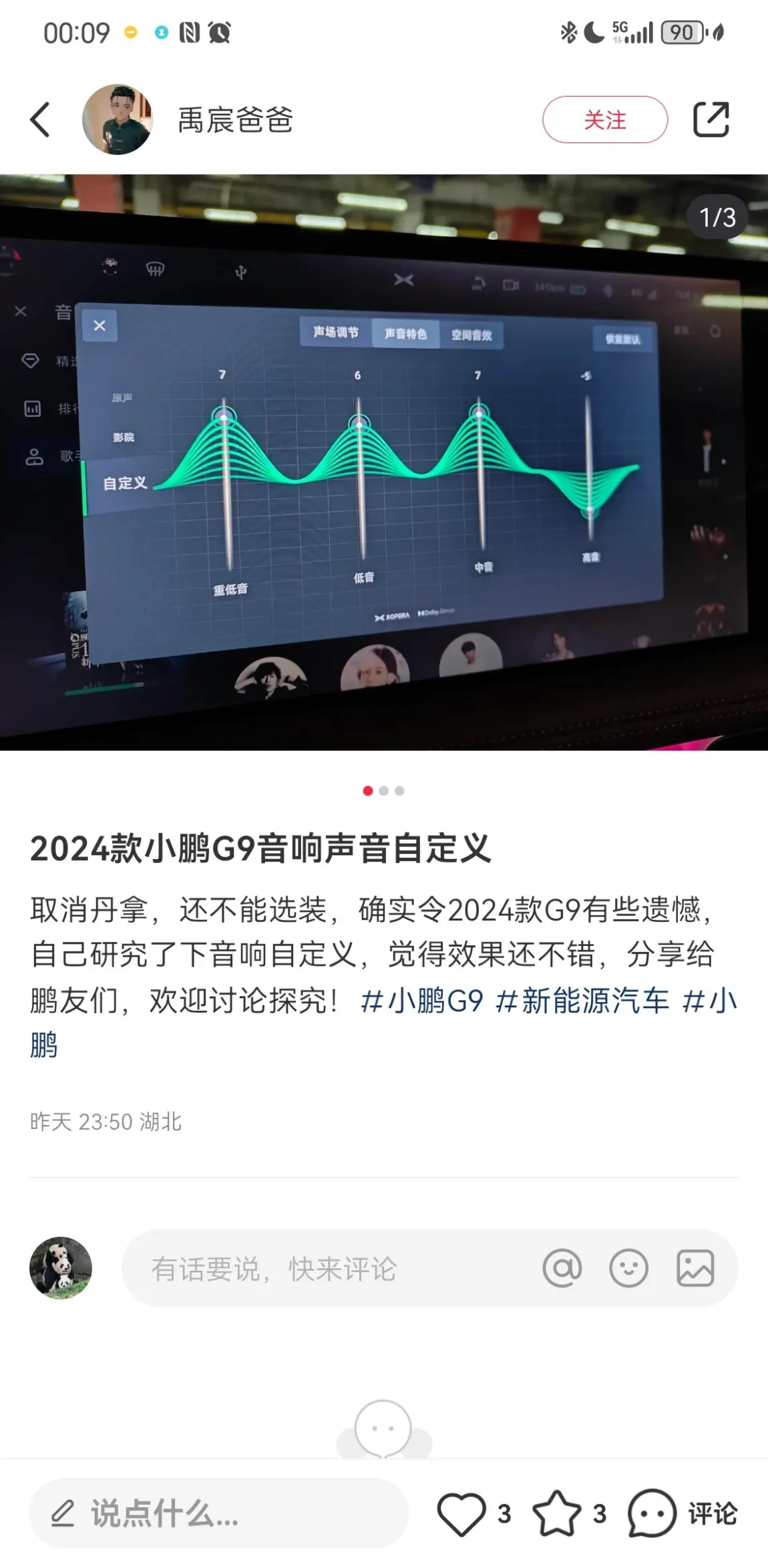 第三是舒适性,座椅几个座位都试了试,基本挑不出毛病,就是前排按摩力度开到最大也有点小,比较鸡肋了。强烈安利海绵宝宝这套摆件,看着很治愈。。方向盘太精致了,手汗多总觉得很伤,果断入手了方向盘套,没踩雷,很厚实,握感超好还没味道,见人就推荐。音响很多人说跟老款丹拿没得比,一开始我也感觉一般般,直到群里有人发了小红书上面这个图,试了下确实强劲了许多,听歌频率明显高了。顶部的天幕玻璃之前一直担心会很晒,实际跑起来也还好,反而是前挡巨晒无比,果断开去贴了膜(强生的中高端的,干掉1400)就好多了。双十一考虑前后排开门两侧装个防踢踏板,不然下雨天脏兮兮的,后备箱也考虑搞个全包垫子,前备箱用的少就算了。