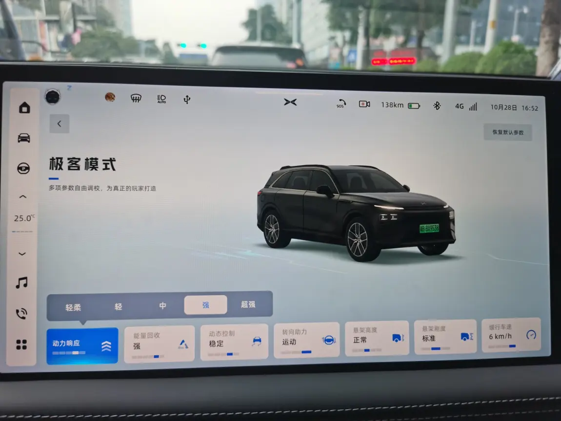 第一是空悬,极客模式里面空悬刚度设置为舒适或者标准,走起来真的很稳,过减速带也完全不颠,期待有机会开到砂石路面试试。平时开高速设置最低的话,估计也会风阻小一些,也更稳。