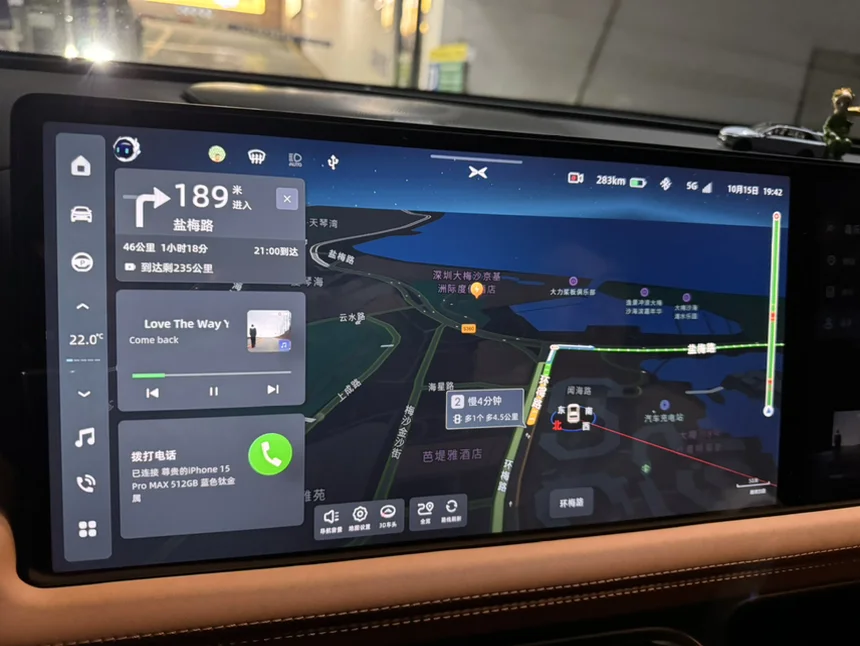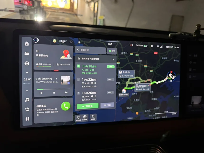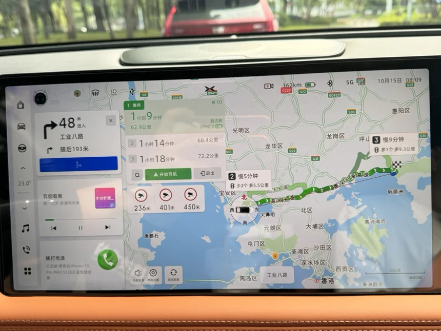 喊小p帮我搜索目的地并且规划路线,从蛇口出发,选择滨河大道+惠深沿海高速,全程无收费路段,导航显示距离63公里,用时1小时9分钟,并且绝大多数路段都可以用NGP,非常轻松省事。