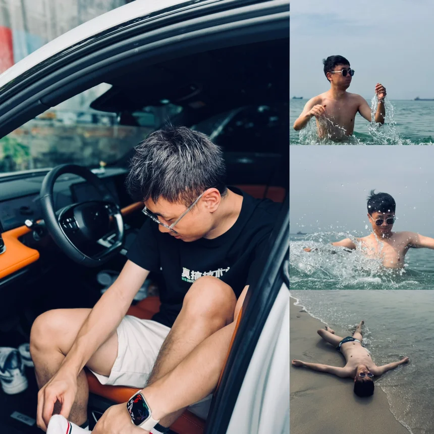 到达目的地,比预计多花了不到10分钟,主要浪费了几分钟想找个免费停车的地方哈哈哈哈,后来还是停在了沙滩对面的停车场,也不算贵,离沙滩近,换洗或者拿取东西什么的还是非常方便的。然后就是下海玩耍啦哈哈哈哈哈。排骨精就是我本人!