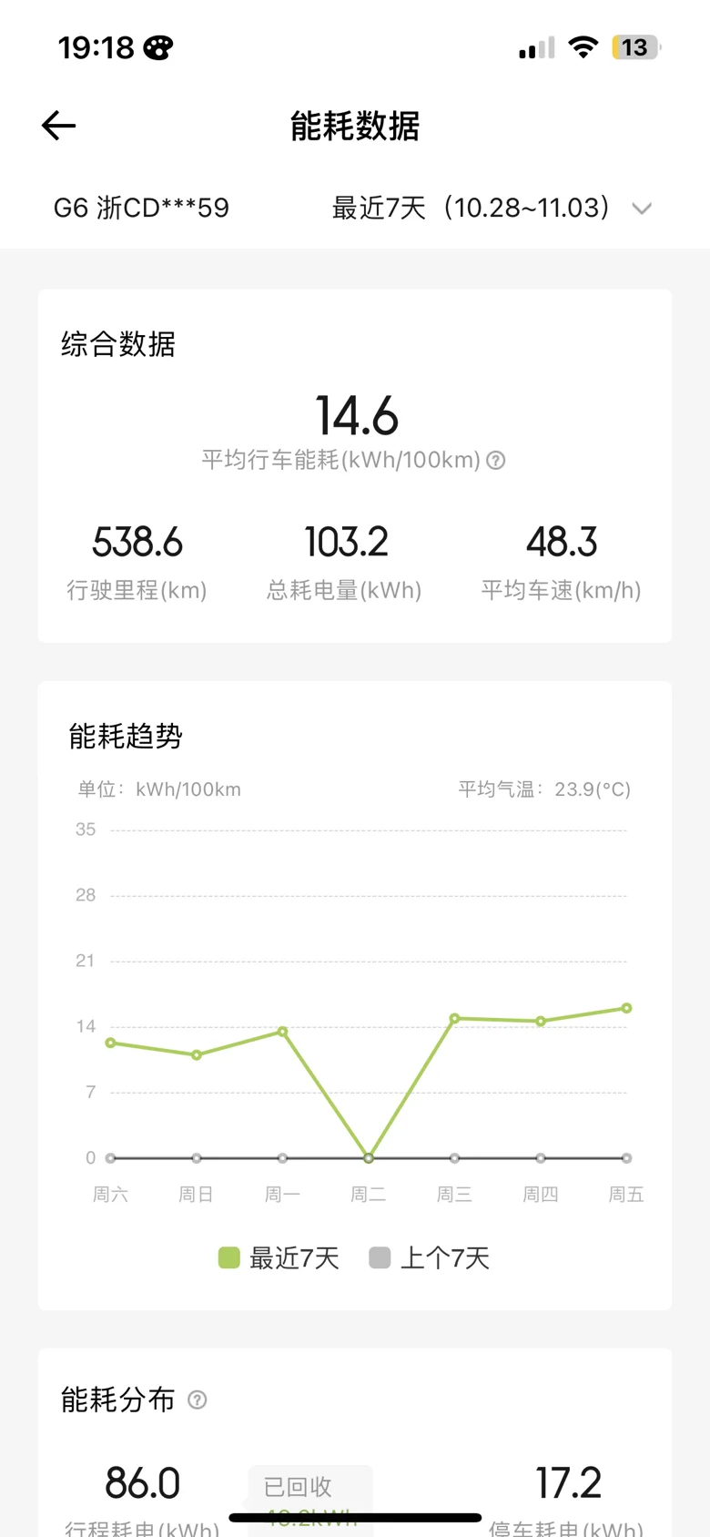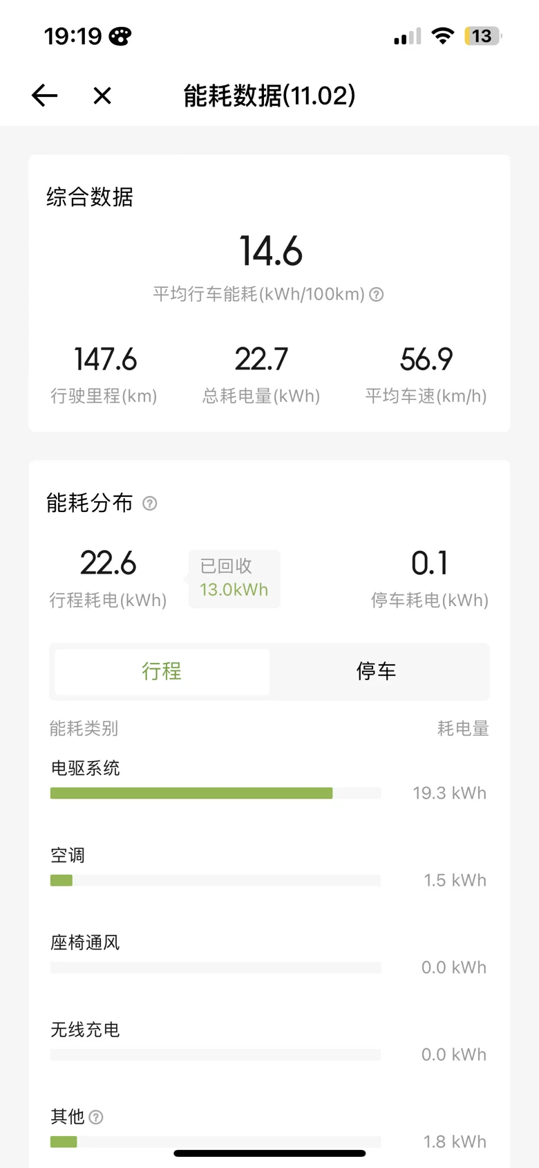 11月3日里程140km,平均车速62,平均能耗达到了16.0,原因是当天天气比较热,气温有25-26摄氏度左右,车上带了4个同事,一车坐满5个人,因为是中午开车回家,所以天气特别热,车上开了全程最大风量最低温度,路况上开滨海大道过去,开滨海大道回来,全程没上高速,但是因为气温、载重等原因,能耗较高。