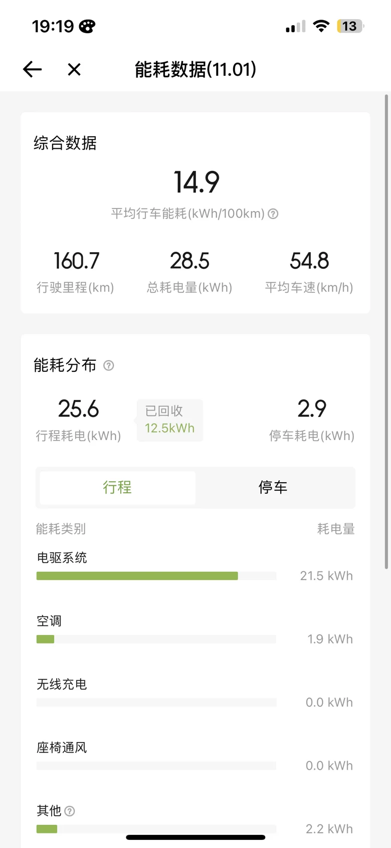 总里程450公里左右,11月1日160km,开沈海高速经机场大道,开灵昆大道去洞头,回来开甬莞高速,因为第一天时间比较赶,所以整体上车速也比较快,平均车速54.8千米每小时,平均耗电量是14.9,因为刚开新车,高速NGP还有点不敢开,所以是全程手动驾驶的,耗电量这一块感觉还是蛮不错的,毕竟高速上速度很快,耗电量平均下来确实有点惊艳。