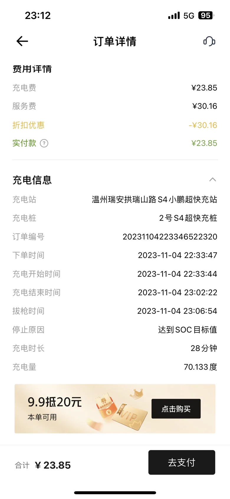 三天450公里开完之后,再加上之前提车的时候从温州开到瑞安,汽车也第一次要去加油了,家里没有家充,幸福的是,刚提车两三天,瑞安市开了全市首家液冷S4小鹏超快充站,过去和同是小鹏车主的车友们一起聊聊天,还是蛮有意思的,重要的是充电速度非常快,28分钟充了70.133度电,真是妥妥感受到了旁边其他品牌车辆对于小鹏鸡柳800v充电速度的羡慕。不过正好当时还有一辆小鹏G9,它的瞬时电压能达到700多v,而小鹏鸡柳最多只能到600多v,所以速度上还是比G9稍稍满了一点点。