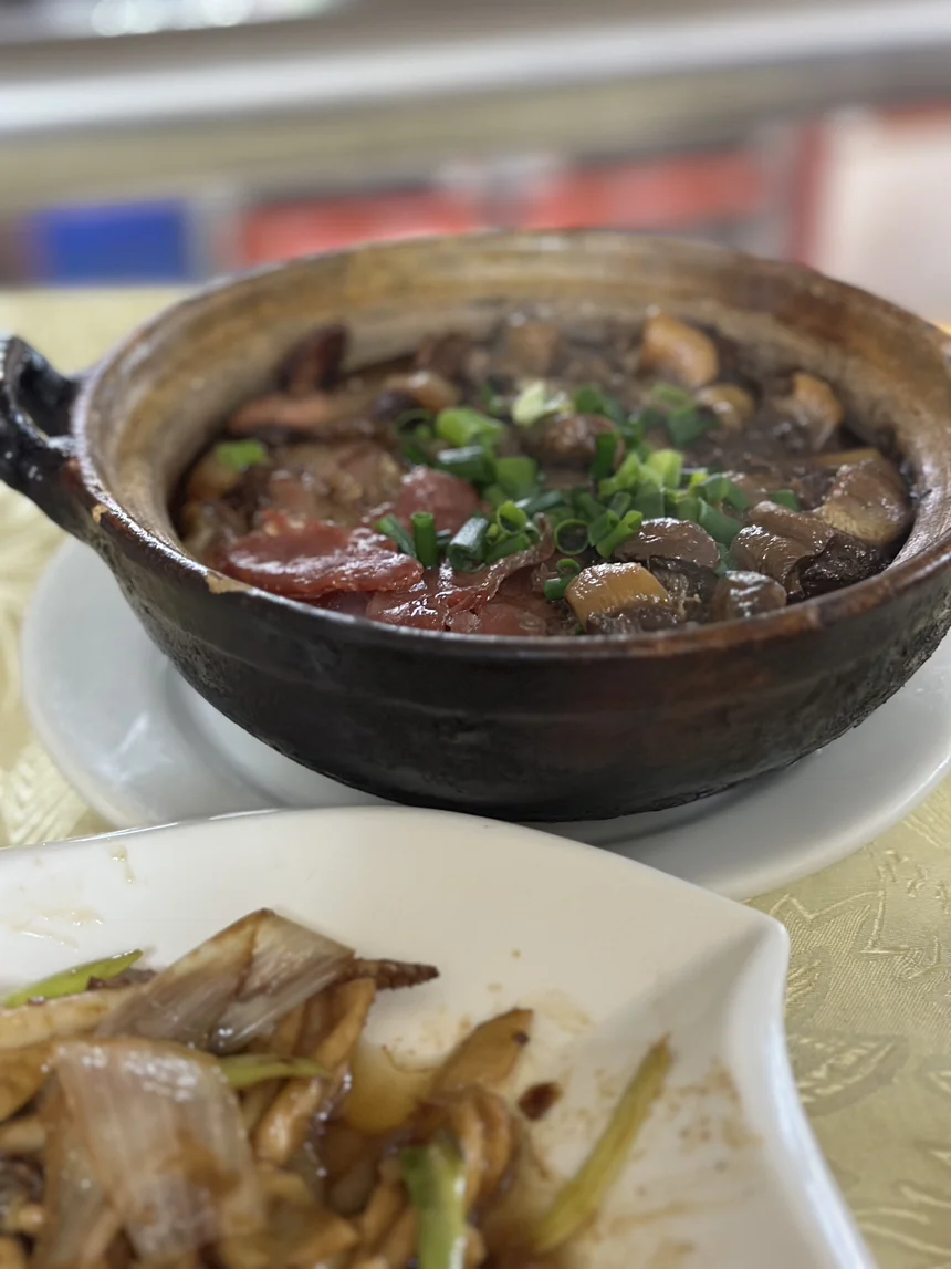 最后一站是晚饭,被本地朋友安利的江利餐馆(新会),有点年代了,一对当地老夫妻在经营,做事有条不紊,点了姜葱炒鲜鱿➕腊味煲仔饭,味道都很不错~