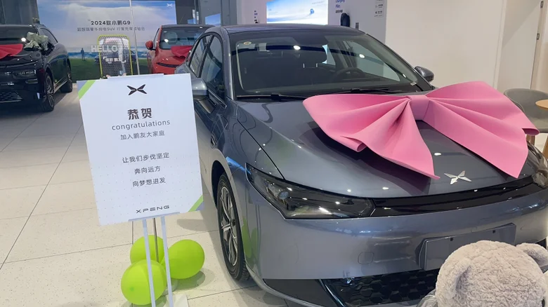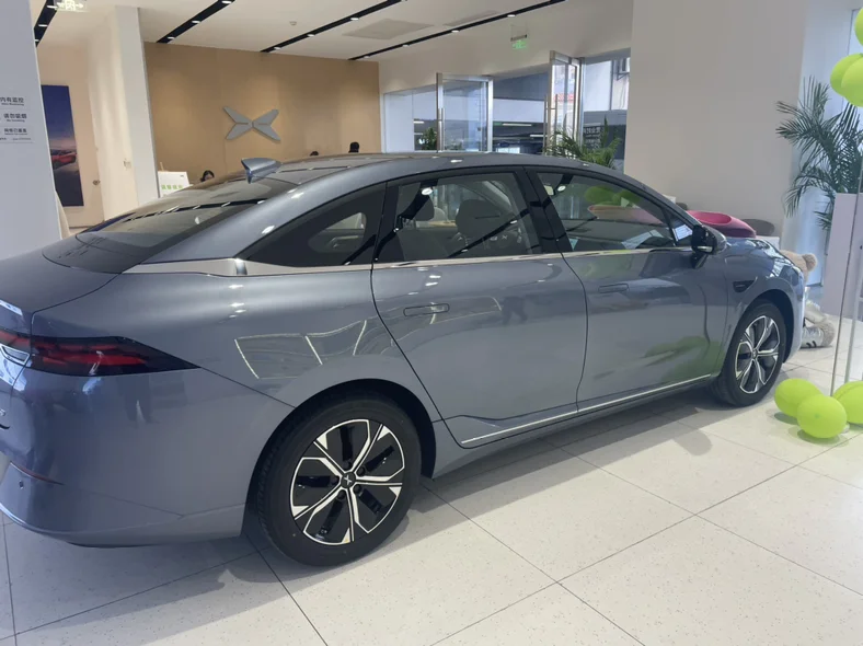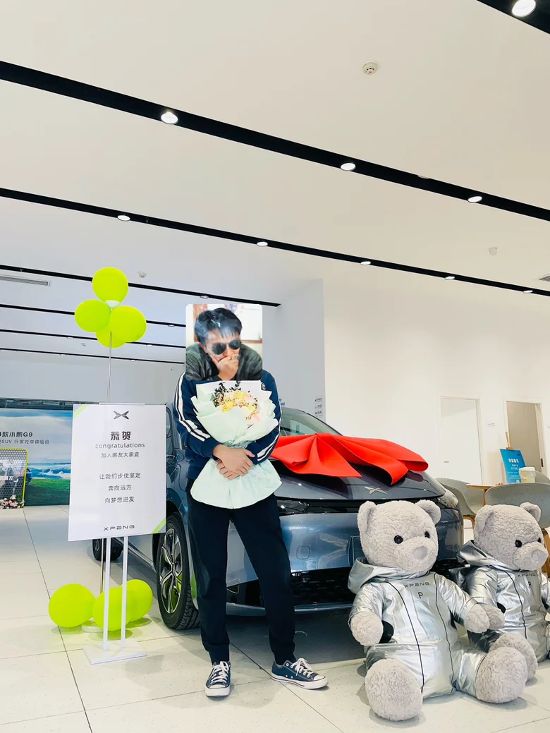 2.一进交付厅,停了三辆车,门口一辆大概就是我下定的星湖灰P5了,后面停了一辆银色G6,一辆星际绿G9。其实外观车型上看银色G6真不错,G9也行但总感觉太中庸了,适合追求有内涵务实低调的人群,当然小鹏这个企业都是务实类型的路线。纯属个人意见,说远了。回到正题,跟我确认是来提车的客户之后,交付人员叫我验下车,看看车漆轮胎内饰,试试空调音乐功能等。在新车旁边左三圈右三圈的转了起来,看到车漆并无异样,就开始蹲在地上不懂装懂的看车胎。据车友的经验,要看看生产日期之类,因为不太懂其实我也没找到,虽说要学着看并不难,但内心想要是这么明显的位置都能出残品次品赝品,那合格质量控制的程度也无法让其生存下去。于是心安理得的为自己的不懂找到了撤离的借口,其实也就1-2分钟的时间走马观花似的看了看。顺利的进入了车内,看到交付人员在主驾驶旁站着,就让工作人员忙他自己的工作去了。我就在车上试了下语音、空调、音乐,然后座椅调整,内饰有无瑕疵等。听了会收音机电台,喜马拉雅听了几句相声,默认的音乐播放软件是QQ音乐,要登录才能听,后面会员什么的大家都知道的。试了下声音大小,调到最大时,配合着左手边档杆不太熟悉的操作下溅起的玻璃水以及左右滑动起来的雨刮器和被雨刮器刷倒的交付鲜花,刚上班的工作人员个个精神百倍起来。除了内饰有那么一点气味,感觉都还正常,车里坐了会,前后看了看,下车跟交付人员说办手续吧。