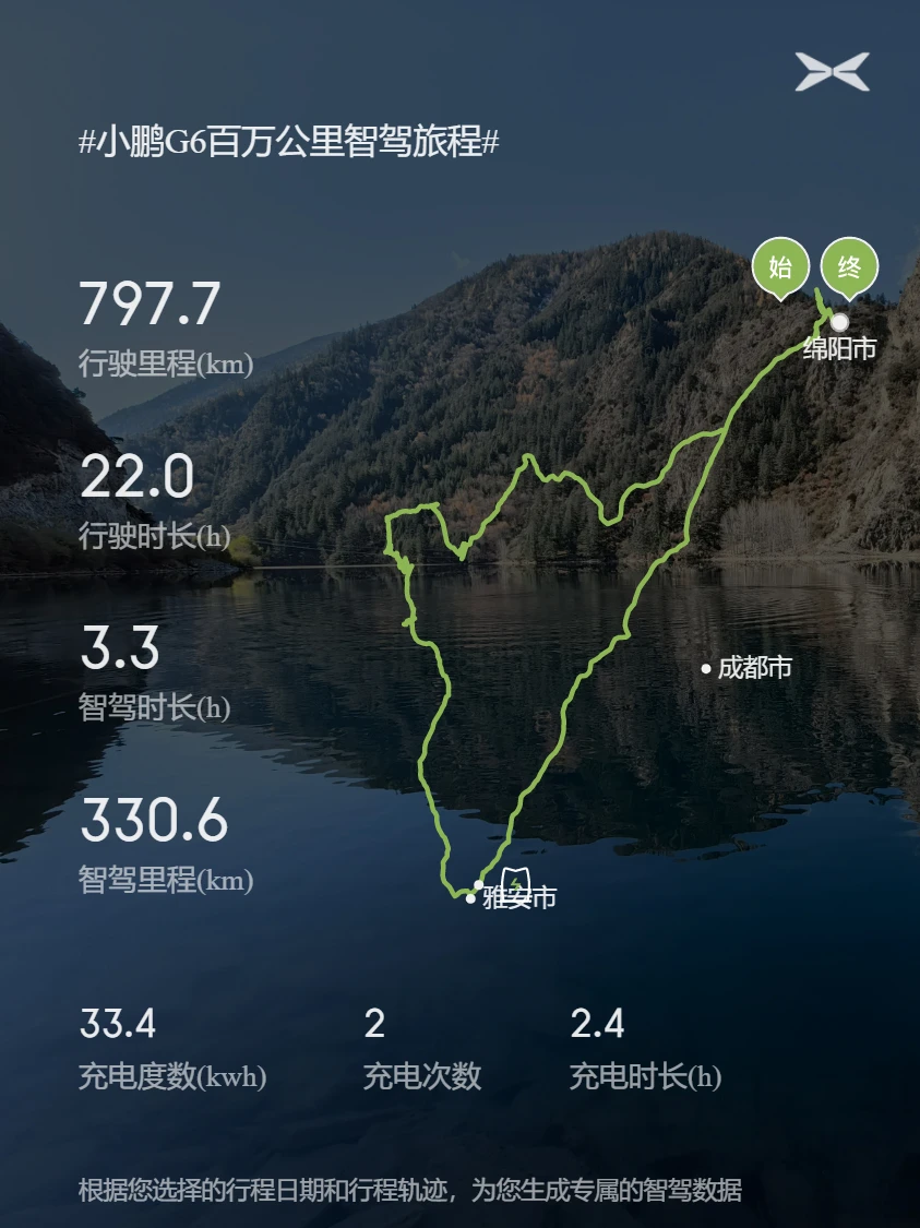 充电:全程充电两次,第一次在猫鼻梁垭口下,名字叫从此益住汽车充电站(海子沟大桥桥下),推荐这个桩,原因是这附近桩少车多,而这个桩比较隐蔽,一般人还真找不到。第二次充电是在雅安小鹏超充站,吃饭时顺便充电。不到雅安的鹏友可以在高速上解决充电问题。