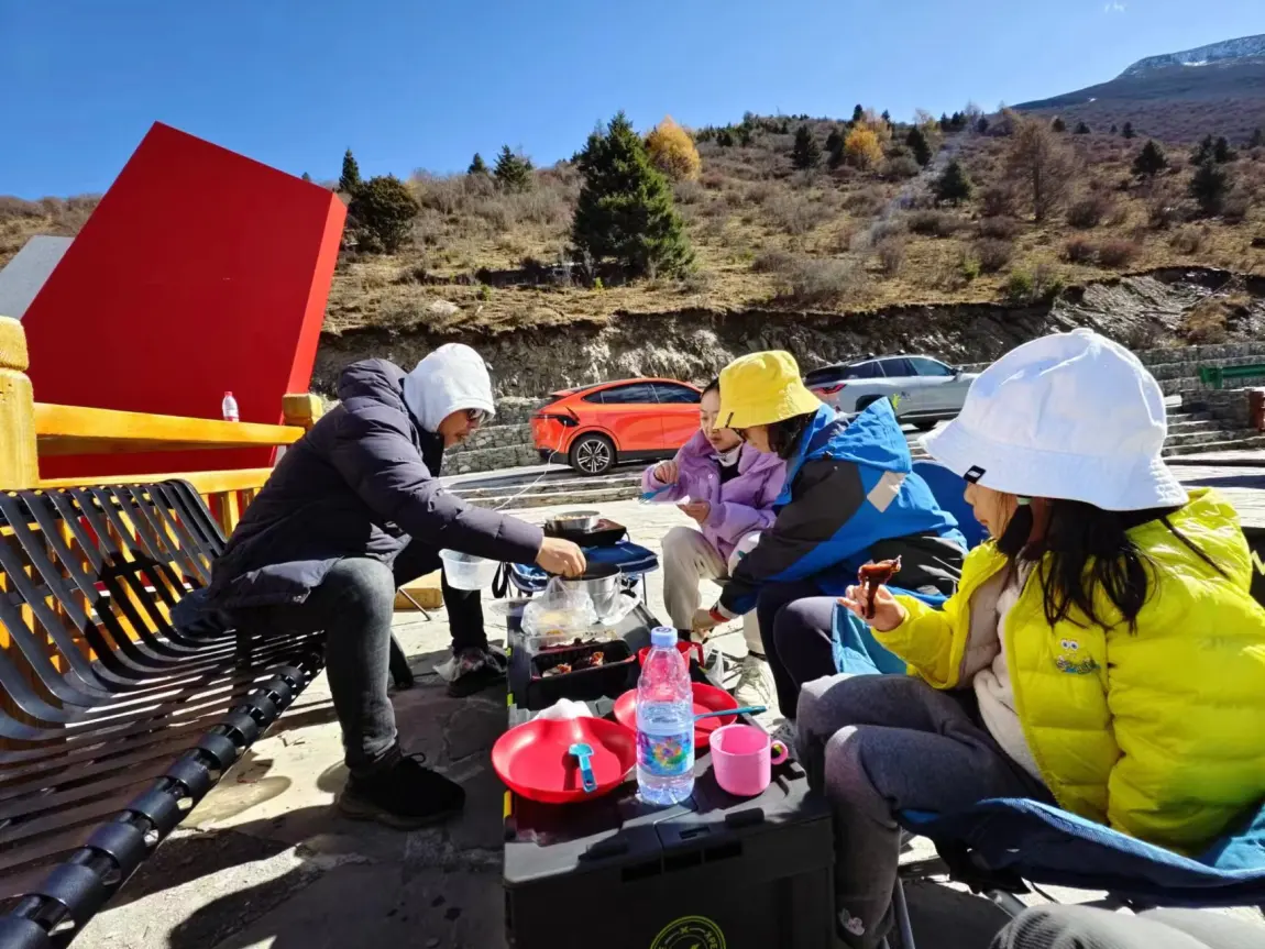 美食:自带!这里不得不吹一下电车的外放电,配上电磁炉简直爽歪歪,当我们煮着火锅喝着茶,看着美景的时候,周围都是火辣辣的目光!不自带食材的鹏友可以迟迟牦牛肉烧烤,味道绝对正宗,有美景的地方都有烤串!也可以去镇上吃吃藏餐,别有一番风味!推荐酥油茶必点!