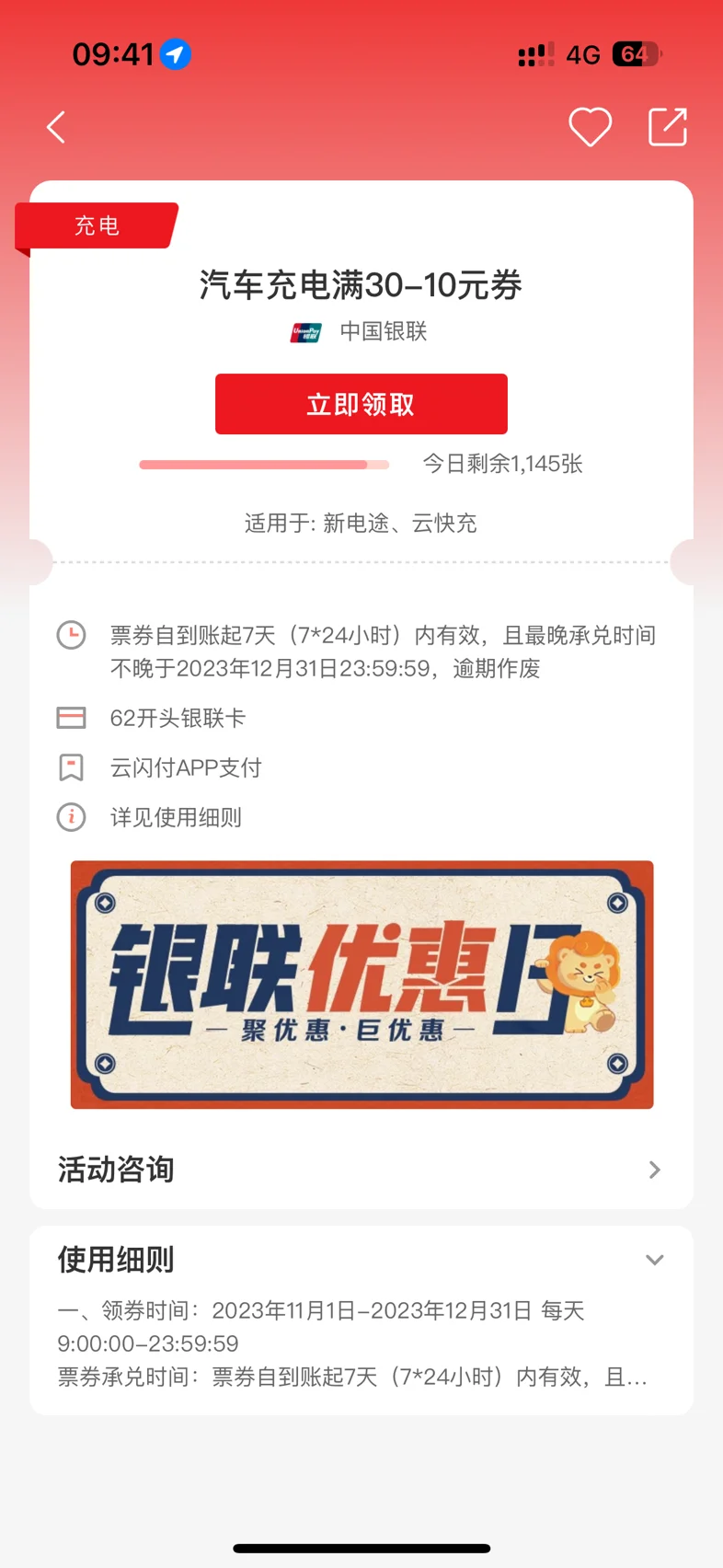 朋友们,云闪付搜「充电」🔋,领取优惠券。🔗链接:https://content.cup.com.cn/UCIWeb/outputWeb/coupon/coupon.html#/couponDetail?couponId=3102023103133704#我的充电省钱秘笈# #小鹏G6# #重庆渝鹏汇车友会#