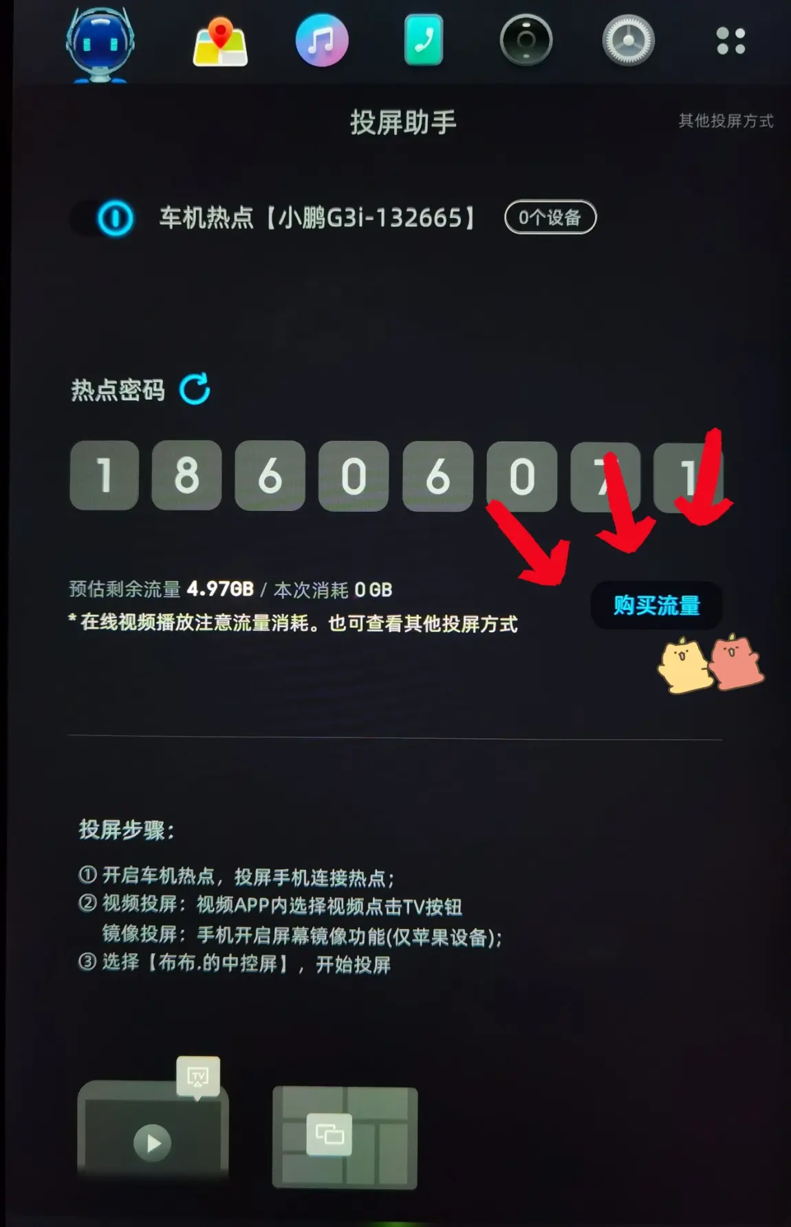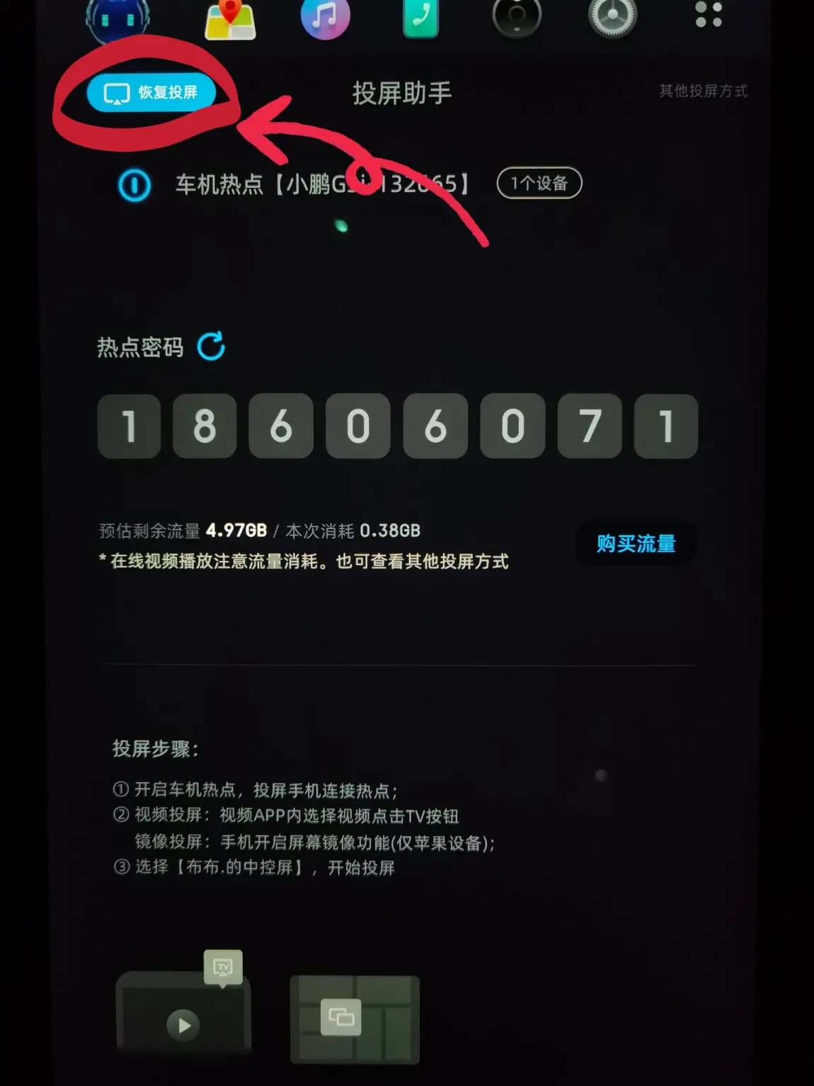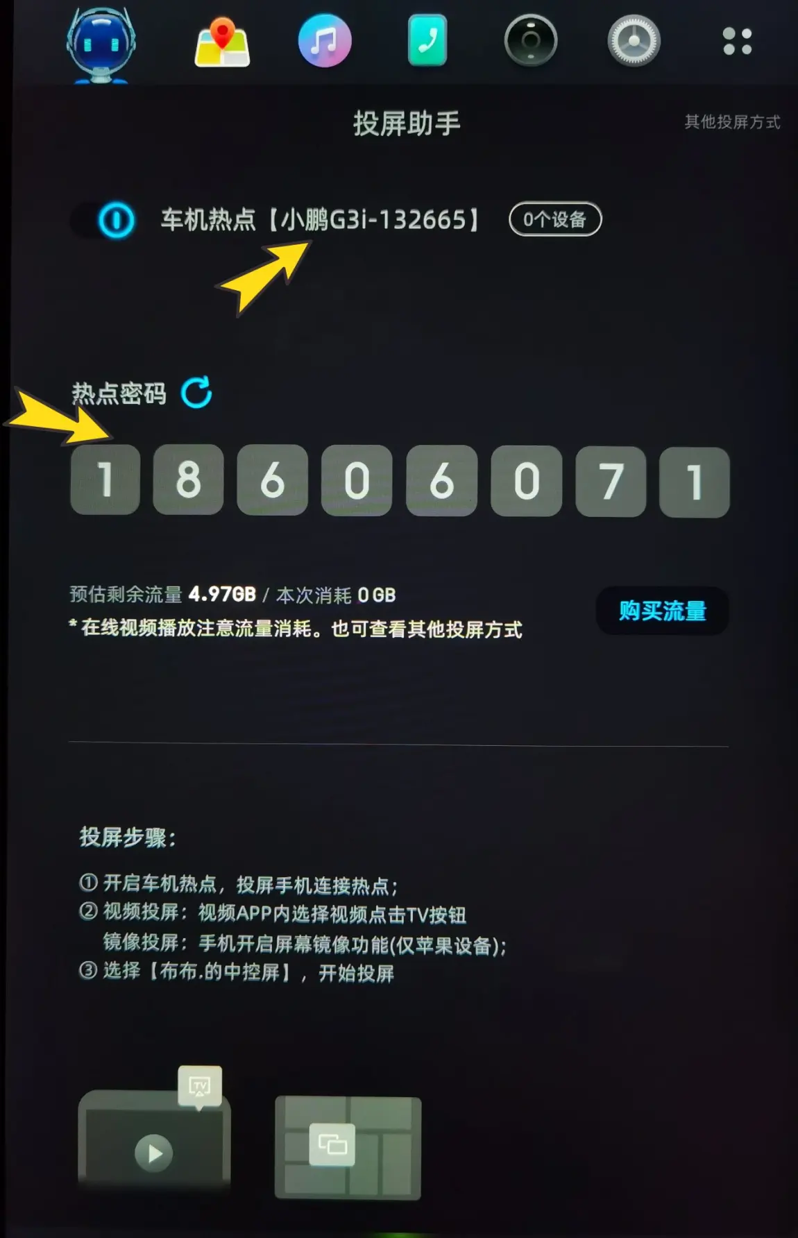 需要特别提醒各位鹏友的是,这种手机连接车机热点的投屏方式使用的是车机自带的流量哦,如果流量不足,要记得去小鹏商城购买。