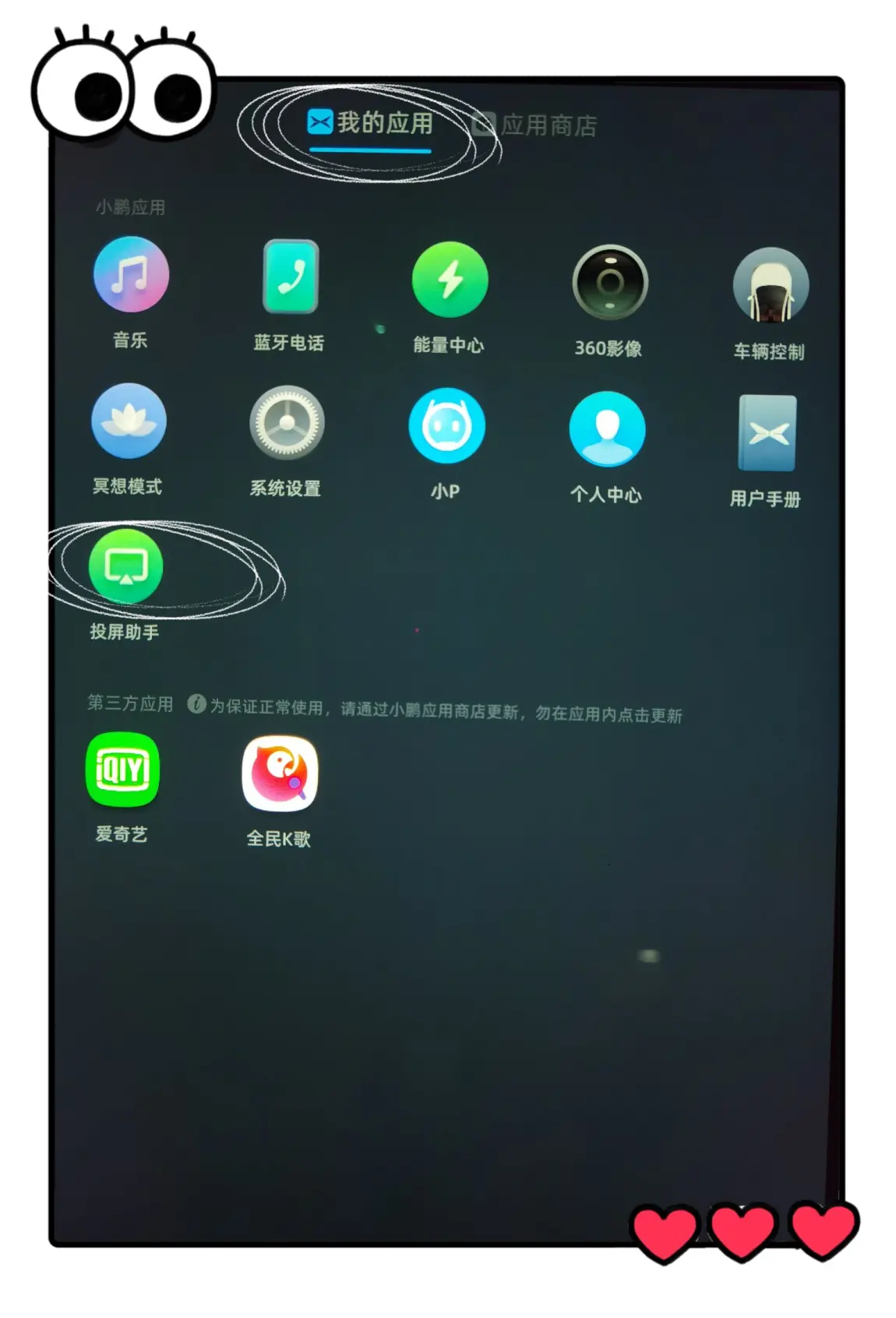 当然,贴心的小鹏也配置了使用WIFI的投屏功能,就是手机和车机可以同时连接同一WIFI,还有使用手机热点投屏的功能,就不用担心车机流量不够的问题啦。具体这样操作。