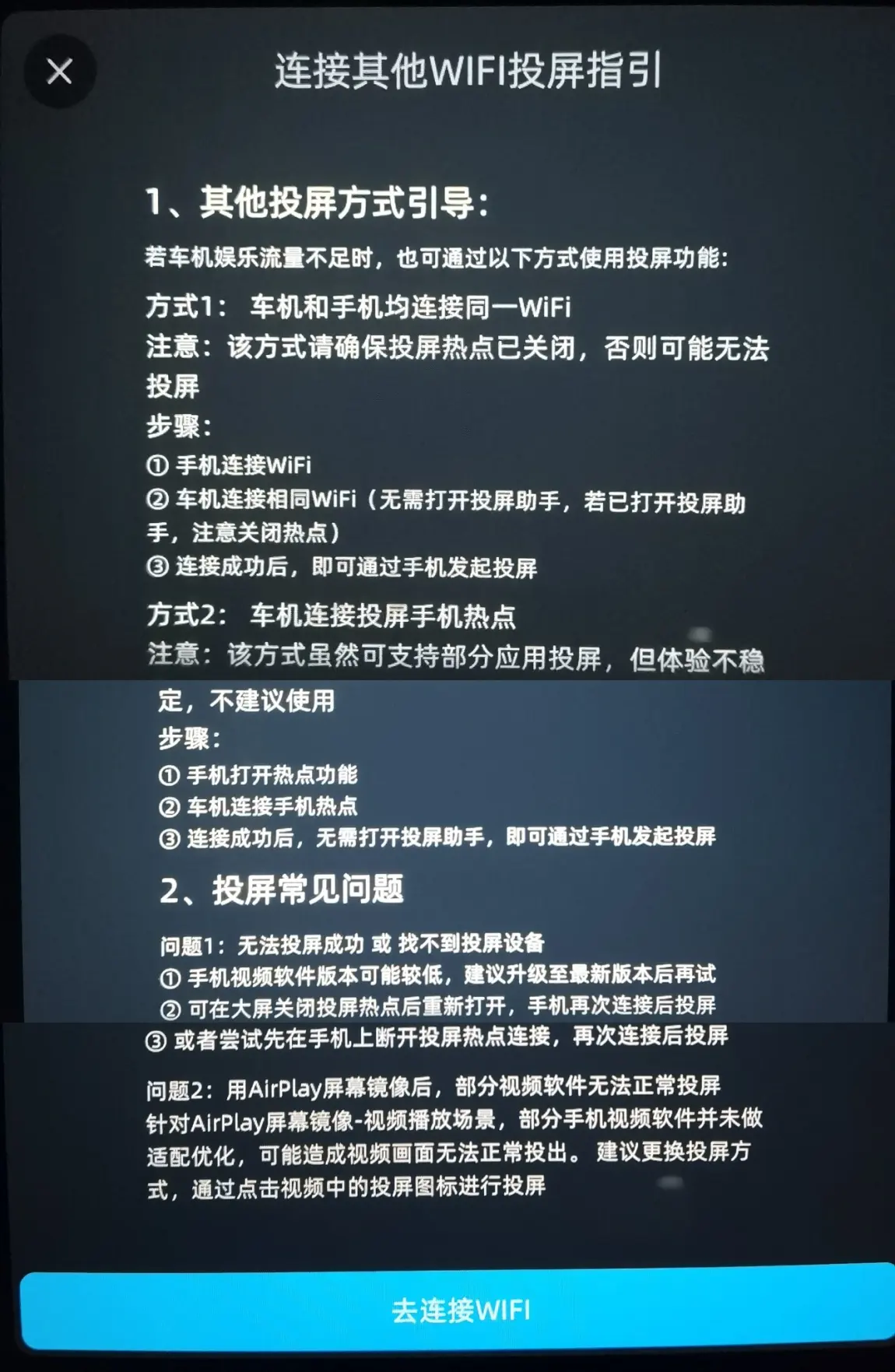 这里使用WIFI投屏要注意的是,车机的投屏热点要关闭,不然投屏会不成功。
