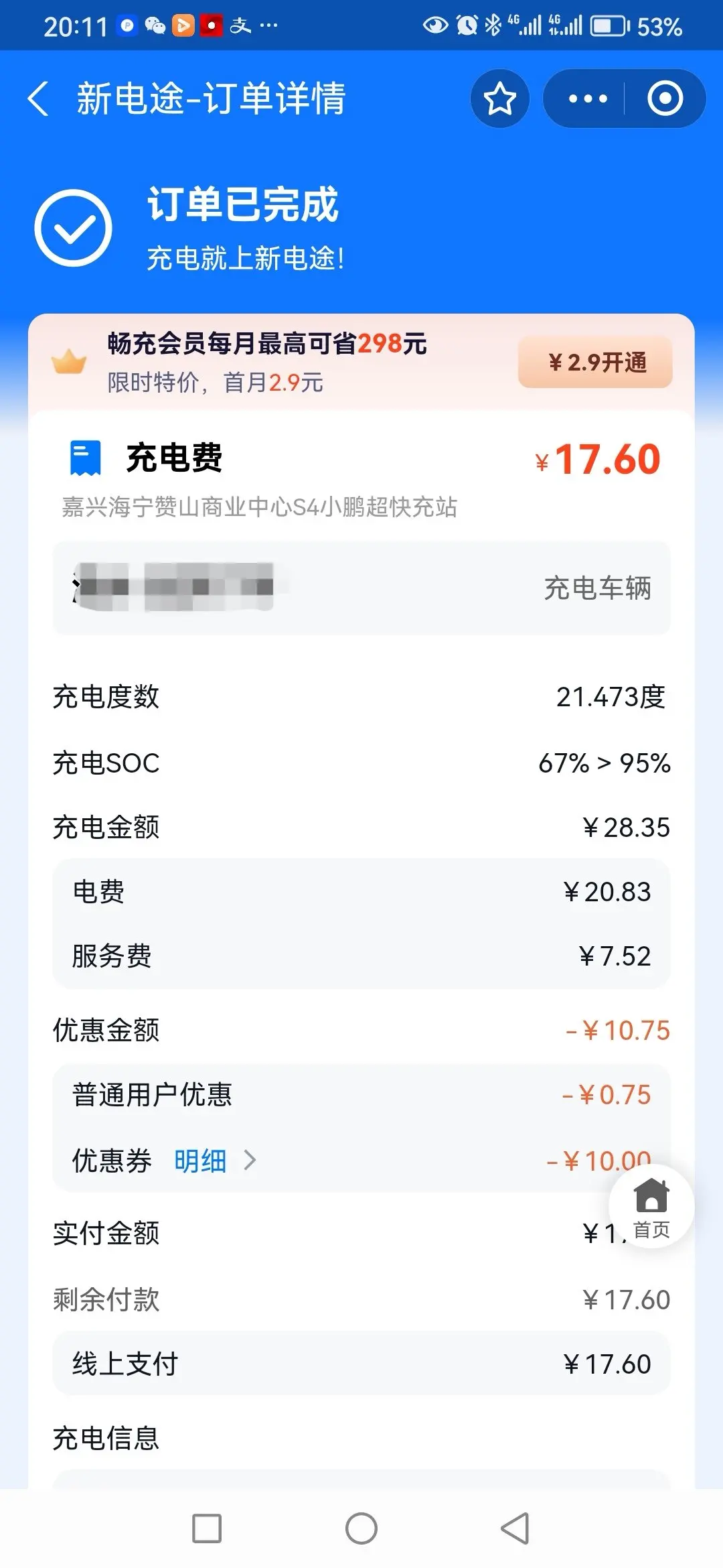 第一坑:通过支付宝新电途小程序扫码,新电途没开始计费,小鹏APP开始计费了,赶紧停止充电,付费0.68元,服务费0.2元通过提车买的1元服务费卡免掉了(我以为一直用不上)@充电小助手