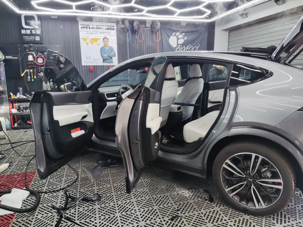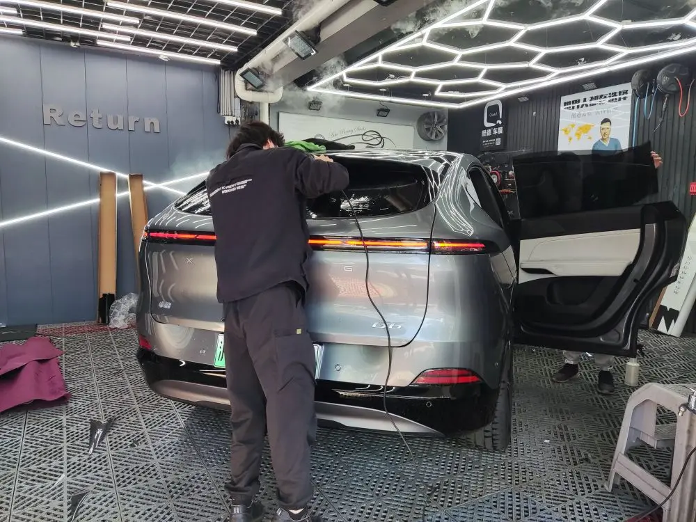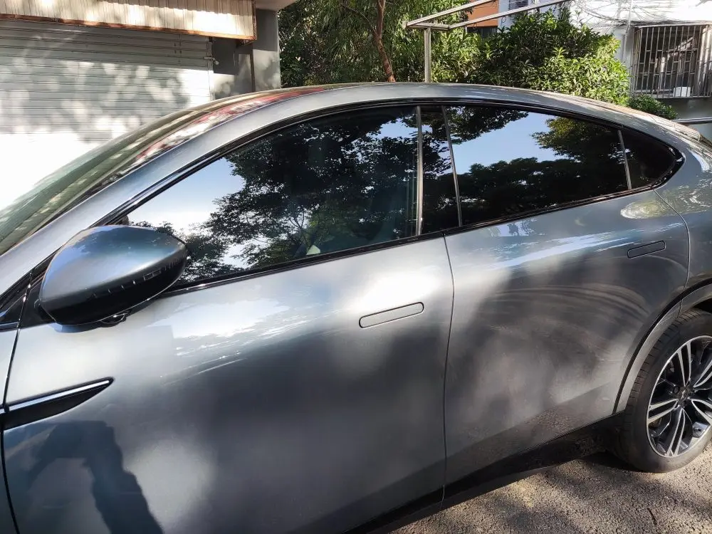 然后去贴了龙膜畅悦,前浅后深,效果不错,但是后档原本就是隐私玻璃,不建议再贴深色膜了,不然晚上基本看不见后窗视野了。