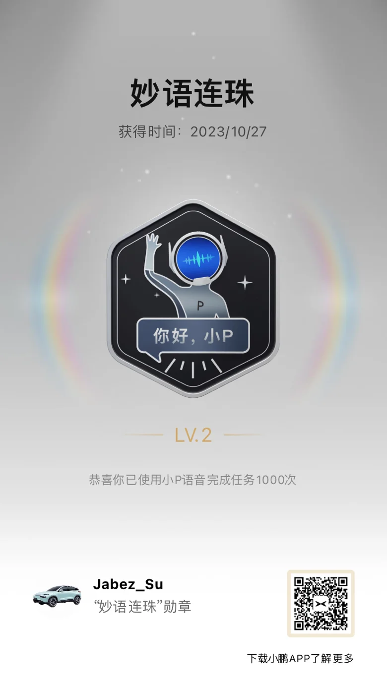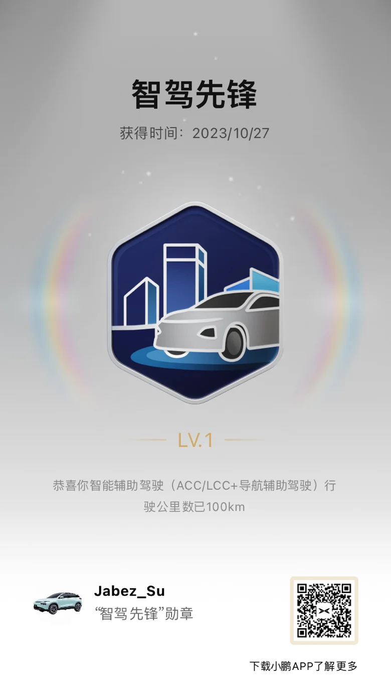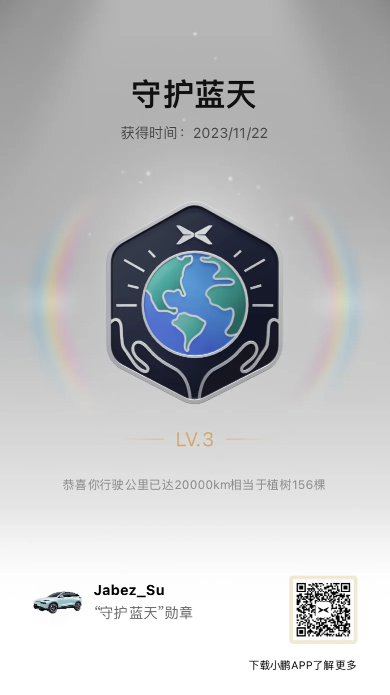 #鹏友们的1024# #我的智能中心# 一早收到小鹏推送的信息,原来是因为里程超过20000km后,守护蓝天勋章升级了。2w公里开下来,不得不说,相比油车真是太香了。操控方便,保养省心,用车成本低。方向盘上右手边的快捷键就是唤醒小p的,平时习惯了能动嘴就不动手了:一份便捷+一份安全。自从开了一次超远长途后,在平时市区路上也不自觉地会常常开启LCC或ACC,仍然是 一份便捷+一份安全。