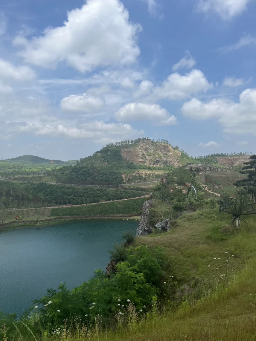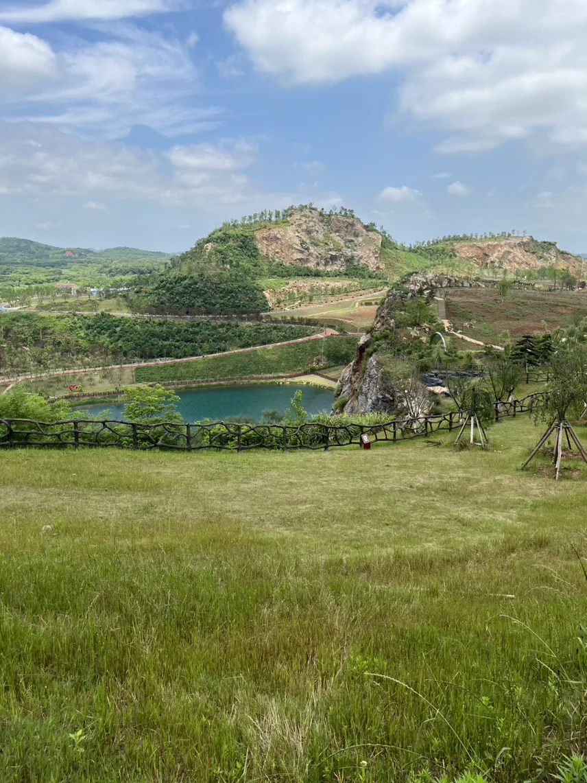 2⃣坐观光车或步行到上山路口下 (路口还有一排“飘带”秋千 反正我喜欢我😅)山顶上有很大一片草原 可以俯瞰整个矿坑 可以在草原上肆意奔跑~