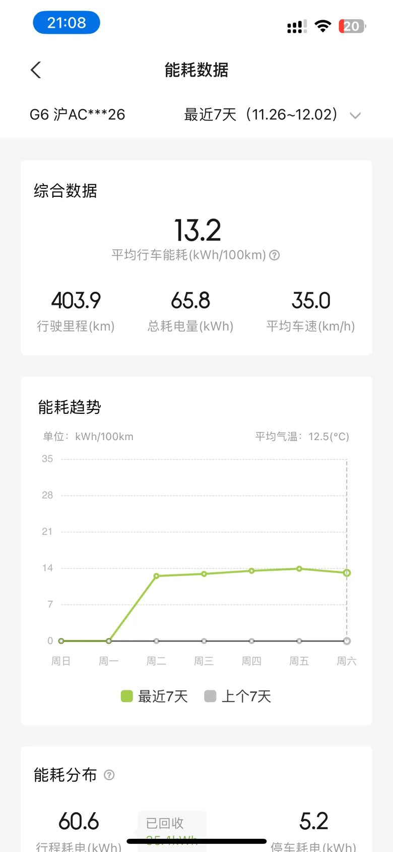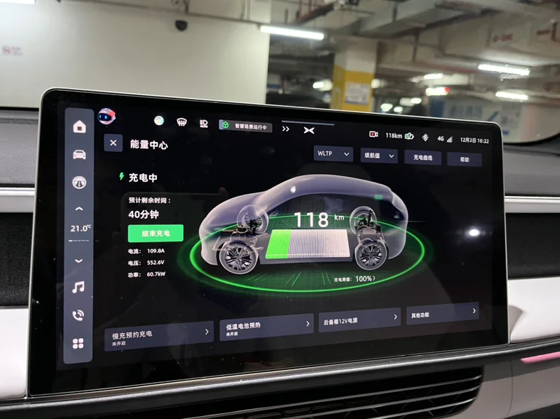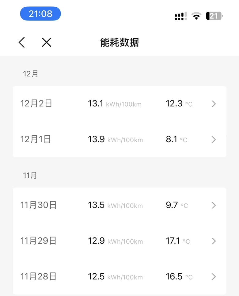 最近上海平均气温是12° 左右,驾驶模式 :标准+中动能回事,上班路程 45km 左右,大部分为高架 32km 左右,高架路程会使用 NGP,周二充满 wltp470km 约 CLTC81 折。实际行驶里程 293.2km, 表显电量 470-115=355Km,293.2÷355=0.82592 约 82 折,此为总能耗包含停车消耗等,非行程能耗,平均电耗 13.2kwh/100km。12月 5日早晨计算单次行程能耗约 1:1,忘记拍照晚上拍下̋(ˊ•͈ꇴ•͈ˋ)