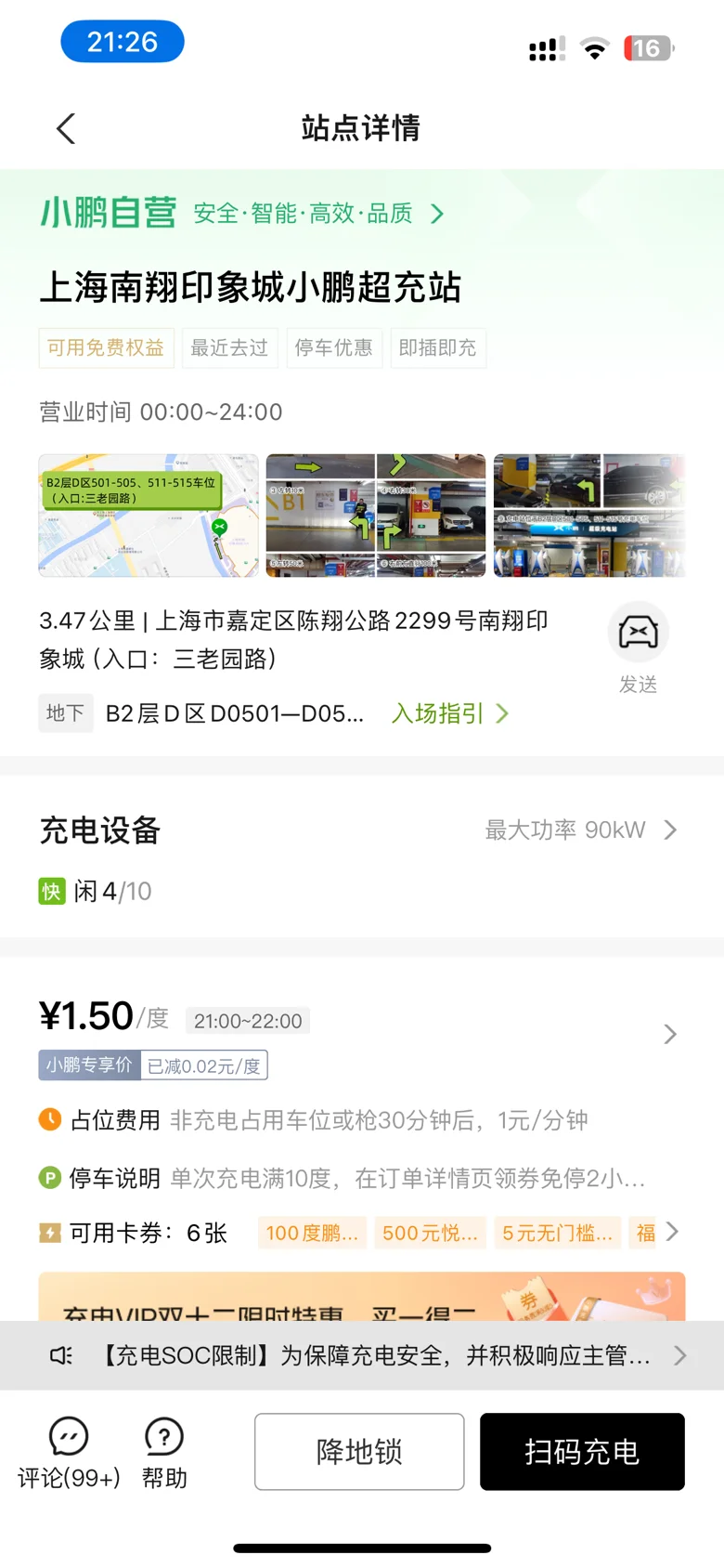 本周提车开了一周的时间,从交付中心提车 90% 的电量,第二天用公司的慢充充满,一直上下班使用,周六出去玩了一趟,回来的时候顺便贴了个膜,看剩余电量 100 多公里,想到上月活动送的电卡就准备去体验下小鹏的超充!
