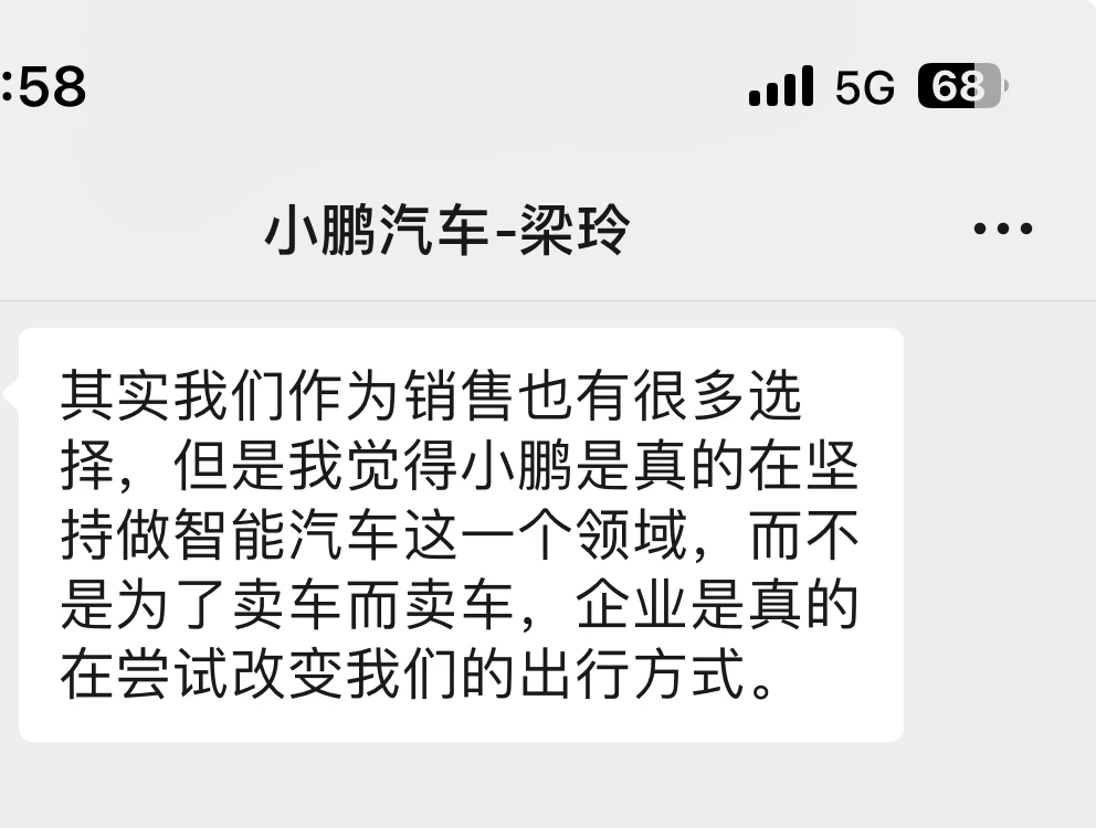 从我内心来讲,我觉得挺对不起之前那位小鹏销售的,因为我最早跟他接触,但是我也觉得让我下定决心购买G9的这位女销售非常厉害,不动声色拿捏了我的想法,引导了我的需求。她是北京长楹天街店的梁玲。说起来,上次买奔驰这次买小鹏,都是在临门一脚的时刻,被销售影响从而改变了决定。倒不是没有主见,如果我不认可任你说破天也没用。就好像我至今觉得没买极氪001很是遗憾,是我这么多年最喜欢的一款车型了,但遗憾他不是我这次想换的SUV。我觉得这两个销售,都非常懂得客户心理,客户的需求是可以被引导的,客户的期待是可以被管理的。比如梁玲,第一次进店她跟我的对话,始终围绕智驾给我的感受,而不是背诵话术,在我思考和回答的过程中内心不断建立对小鹏优势的深刻印记,心理学上叫锚定;第二次吸引我回店没有告诉我是白色(她先用别的颜色让我回店,才有后边的机会),她懂得柔和而坚定的告诉我,她已经扣下了车但只有一天,不动声色给我给我施压;她恰如其分、恰到好处的在我要试驾其他品牌车型的时候,给我发来给我调配的车照片,建立我与这辆车的联结,加强我在试驾中不断与G9进行对比的心理暗示。更深一层,我觉得,最好的销售,不在于技巧,在于对自己品牌的爱和对客户最大的诚意。奔驰的销售和小鹏的梁玲,都是这样。我记得当时奔驰的销售载着我们不厌其烦一次又一次让我们感受细节:你看,自动泊车怎么玩儿……前面减速带你加速开过去,看看这个车的神奇底盘……那个时候,他不是一个销售,你能感觉他发自内心对奔驰的自豪,和他对这款车的喜爱,他特别希望把他的感受分享给你,让客户感受到奔驰的每一个细节。梁玲也是。这是我提车之后跟她的对话,你能感受到,她对她所在的小鹏,是多么的认可。