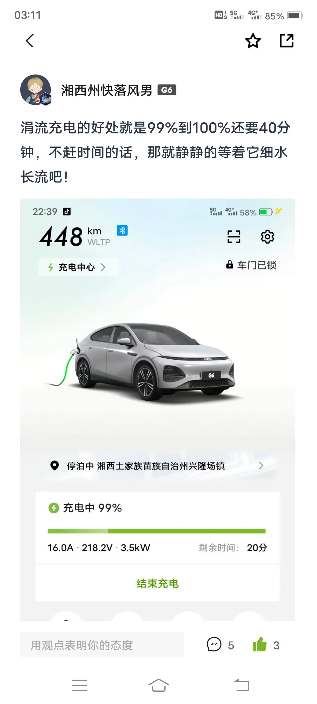 因为是第一次开电车的原因,还是按照油车“地板油”脚法,定速巡航维持在110-125之间,全程1000公里,90%电量出发,高速上充了4次电,每200-240km做好规划充电。当时,在并未开通xngp的权限,仅仅用了acc还是Icc,真的对于我一个从来没接触过辅助驾驶一直开油车的我来说,小鹏最基础的辅助驾驶都已经足够惊呆了我,一路上我疯狂和我老婆说,这也太舒服了,第一次开车这么舒服,它竟然智能到可以自动识别前车距离,加减速,此刻的我,在你们面前,就是个乡巴佬,就感觉小鹏是真的香。小结:高速共计充电四次,电费270元,全程1000km,安全到家了,也结束了这一次圆满又充实的广州提车之旅。