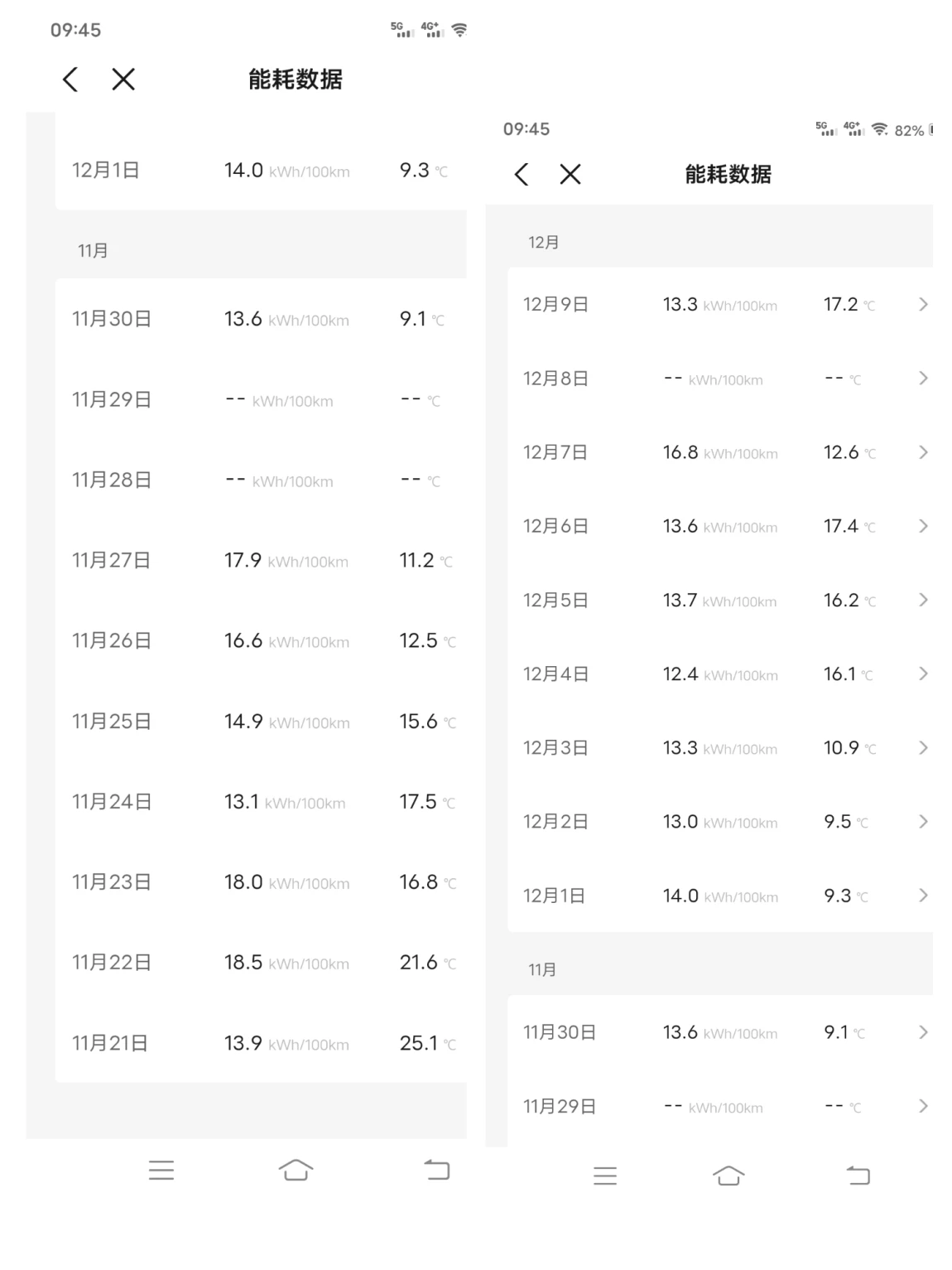 11.27-12.03期间,行驶了468.3km,百公里平均电耗降到了13.8;12.03-12.09,更是进一步降低至13.5。