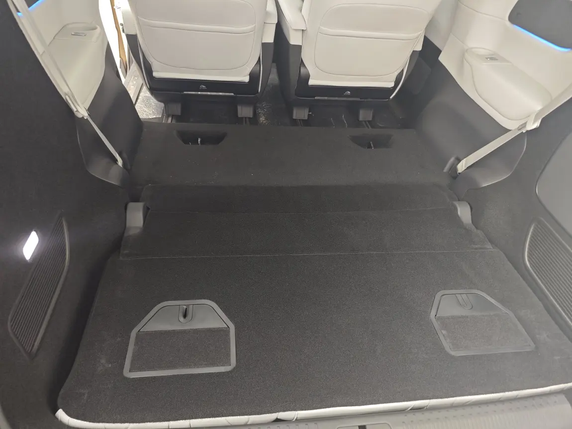 到店的是无过道,配两个航空座椅的车型,零重力模式下可以休息按摩的同时也可以将后排大屏幕调到合适的角度来观看视屏,体验很赞。第二排后背设有一键移动进出第三排的按键,很方便。将第二排调到一个非常宽敞的位置后,我本人170cm,坐第三排还有一拳多腿部空间,坐姿适中头部空间有余,不压抑。给我印象最深的还是第三排的折叠功能,第一次在网上看到的时候还是很震撼的,今天特意试了一下,可以两次折叠形成一个大平层,听说这一点把某某高铁,打回原形了[doge],好评。