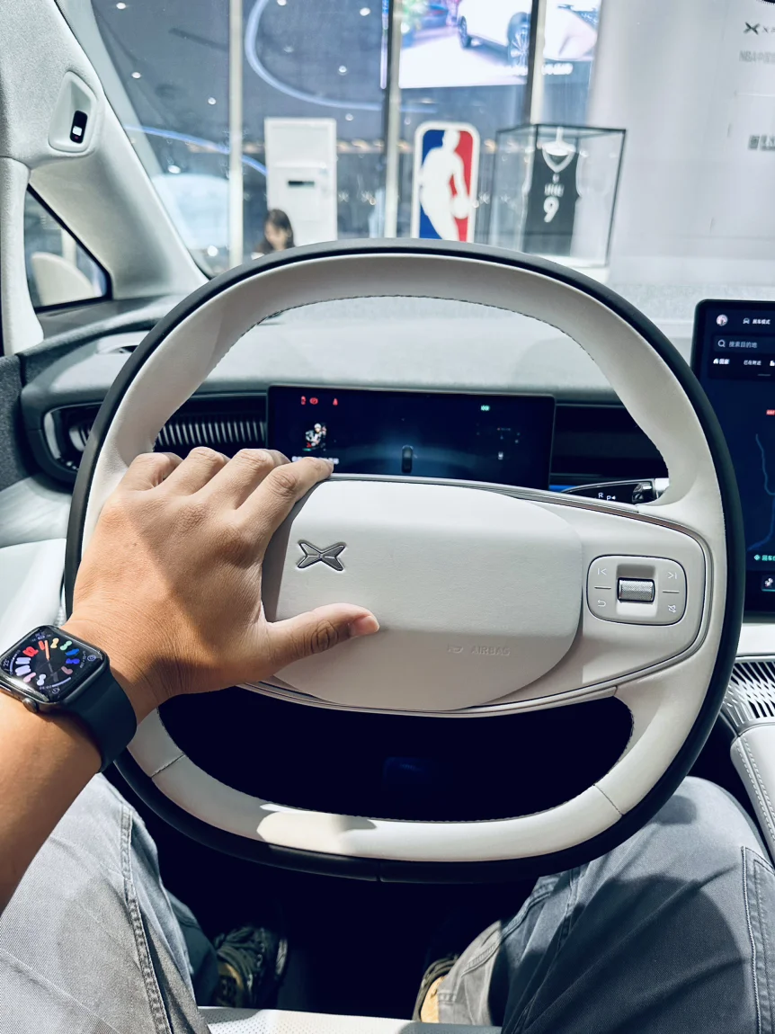 坐进驾驶舱体验主架座椅,座椅比鸡柳厚、舒服、包裹性强,腰部支撑强😌方向盘与鸡柳无异,感觉差不多的材质,不过这小鹏logo会不会有点强迫症发生哈,我是没啥感觉,看久了还顺眼😜