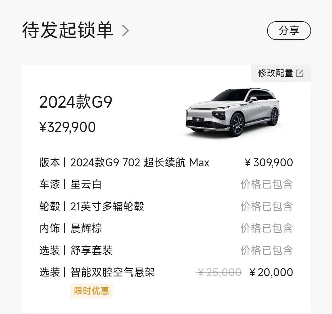 我便没多再犹豫,“很熟练”的打开小鹏APP下订。现在随着SKU的精简,用户选购也非常方便,不用像蔚来那样一个个来来回回加减选装然后心疼钞票再退回去重选。小鹏现在选车流程也很“简洁美”:电池和续航,有家充的选磷酸铁锂版本,像我老小区不方便装充电桩的直接就干702三元锂版;NGP,小鹏的灵魂+未来不断蜕变的基石,一定要选Max;我露天停车场,纯白色最耐脏;21寸大轮毂+舒享套装Max版自带送了;另外为了体验极致的舒适度,我还选装了双腔空气悬挂。