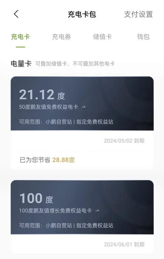 在小鹏APP上每月获得400点鹏友值,还会送100度电卡,能在权益充电站享受免费充电。搭配家充使用,基本用不完,好处是在外面充电不用考虑时段问题,小鹏替我免单。
