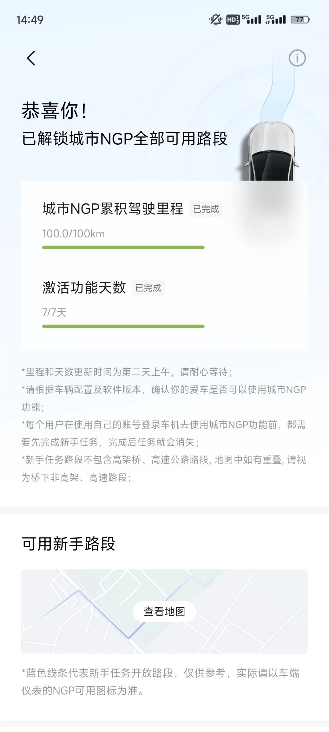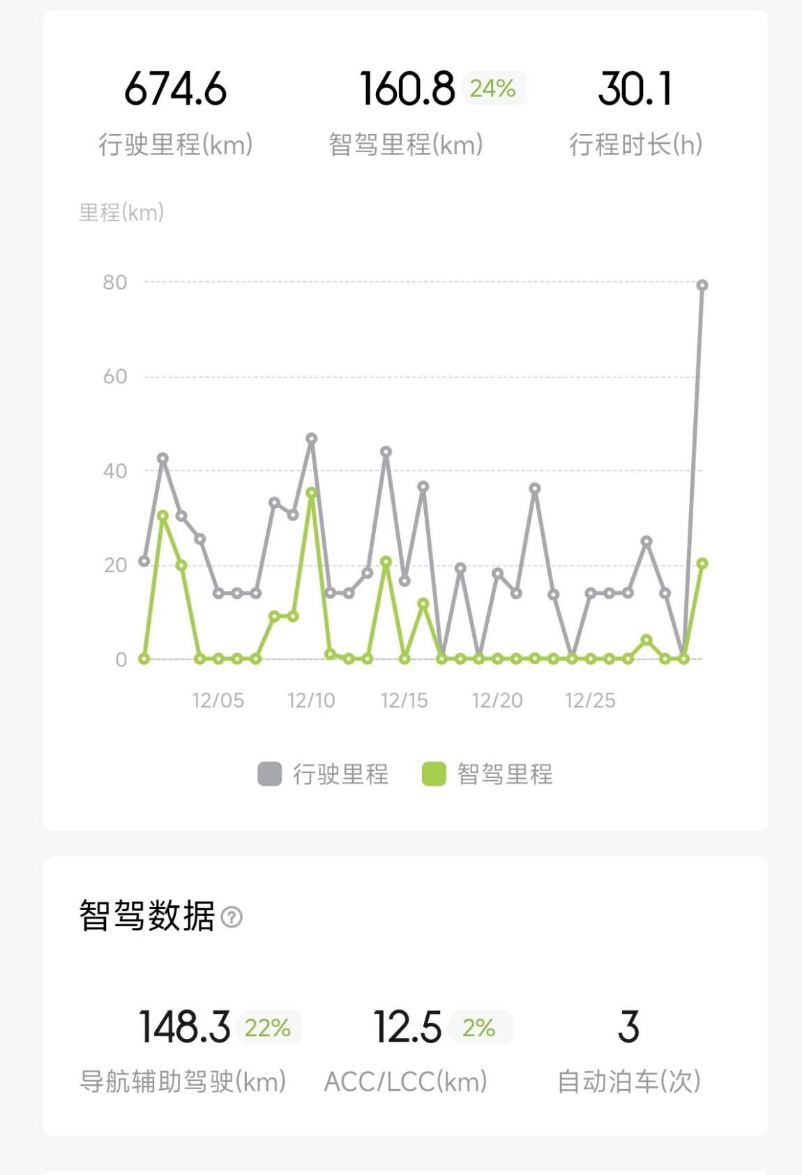智驾体验: 十二月经历了两次的系统版本升级,整体体验非常完美。因为上班路线没有开通XNGP,平时晚上或者周末的时候会使用。整个12月完成了100公里的新手村任务,解锁了全部路线。